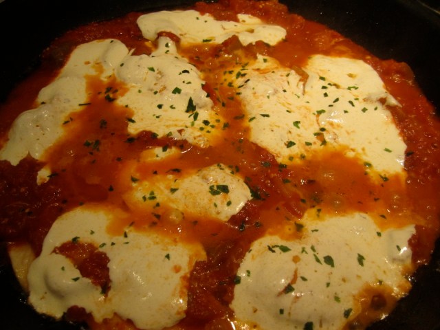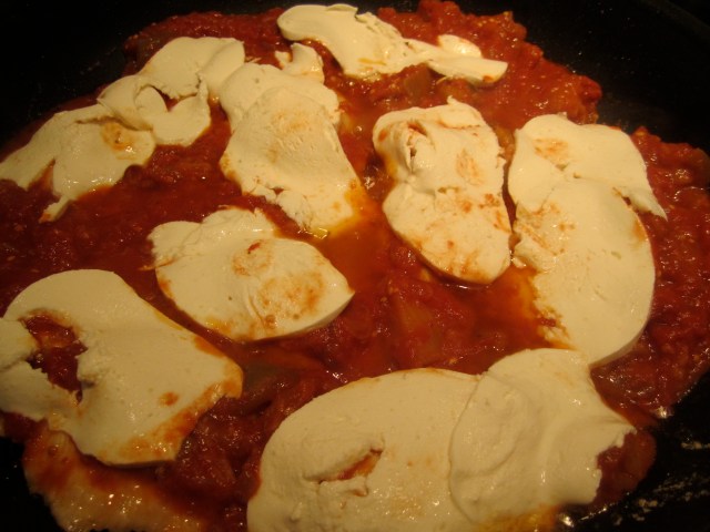 Scalloppine refers to thin cutlets (I’m using chicken tonight, but you could just as easily use veal). The cutlets are dredged in flour, then lightly browned in olive oil. Slices of fresh mozzarella are draped over the chicken, then the sauce is gently ladled in and around the chicken. The skillet is covered and allowed to gently simmer about 10 minutes. There is no recipe per se, simply an illustration of technique.