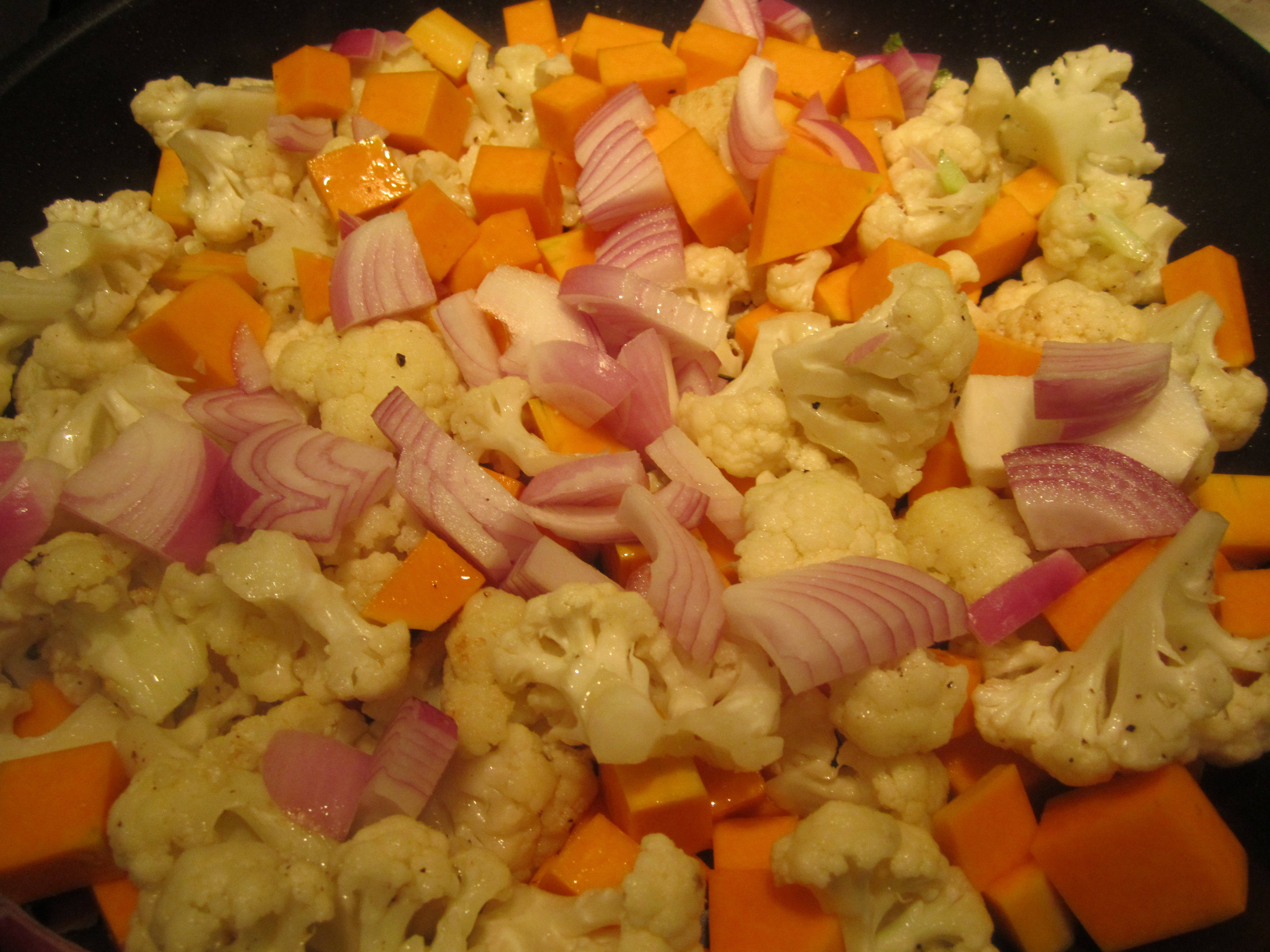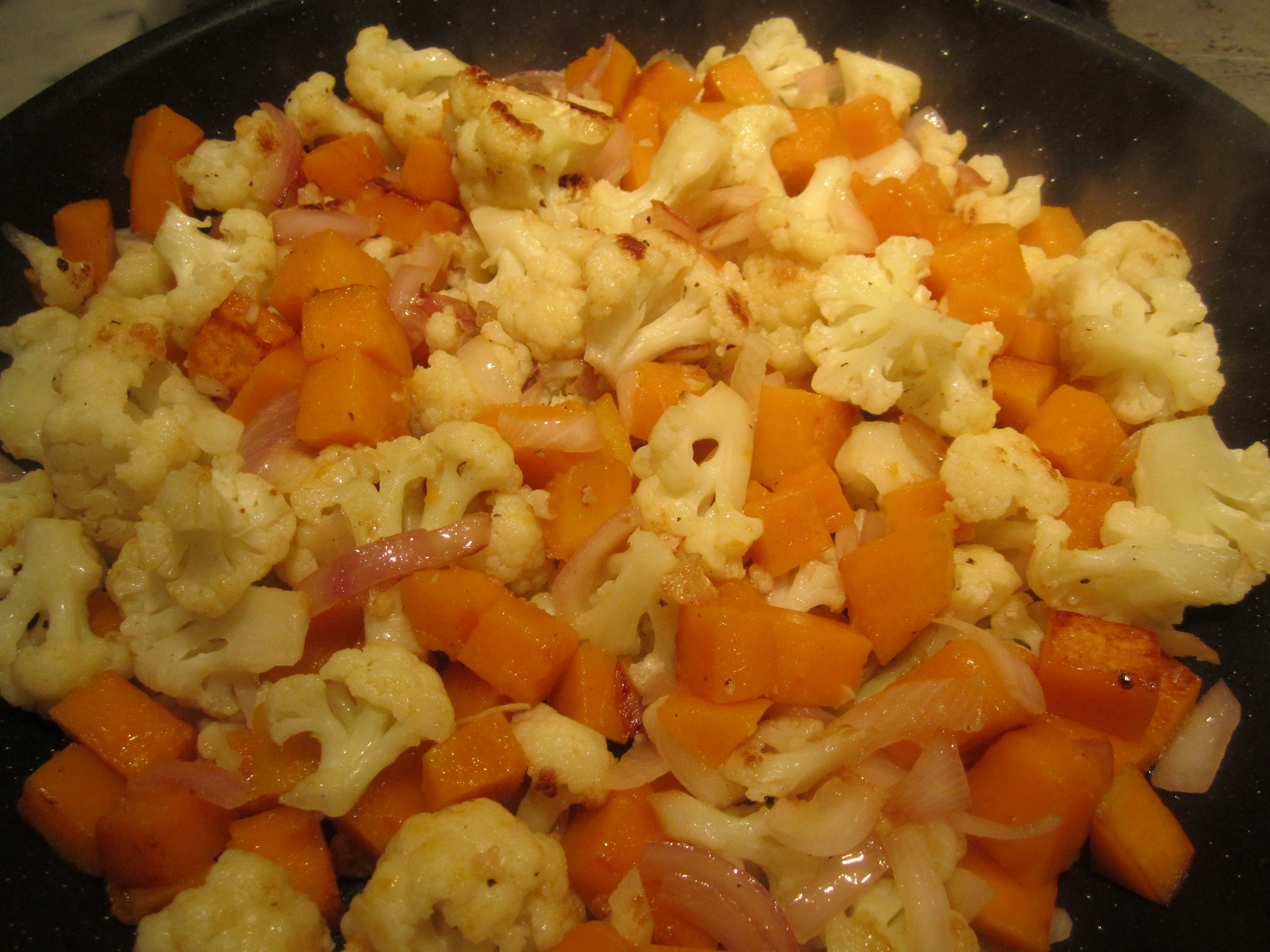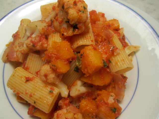 This dish is a great combination of earthy and sweet. Since cauliflower and butternut squash are available for the next few months, I’ll make it often. You can use this sauce to dress any of a number of pasta shapes, including whole wheat or farro.