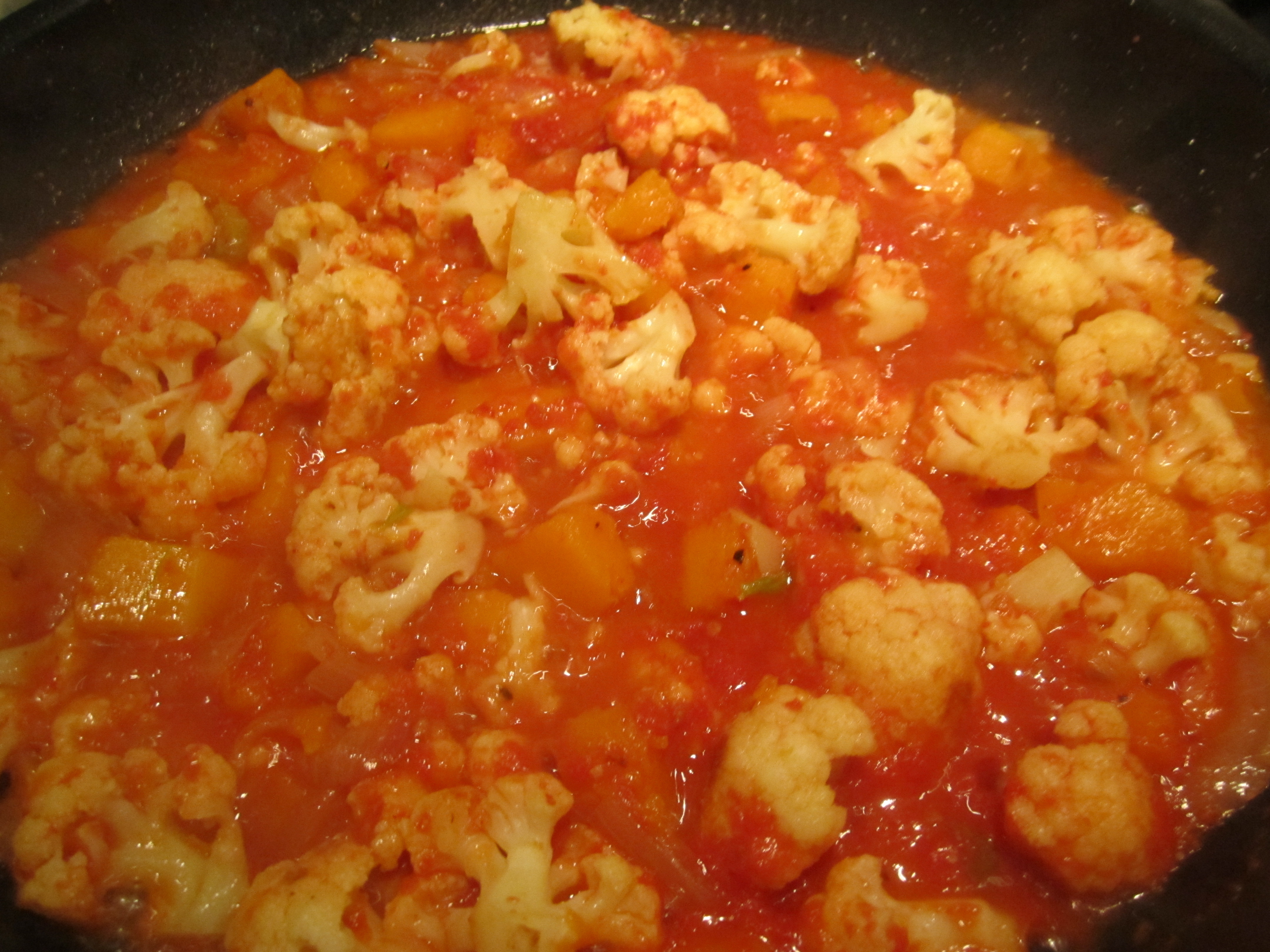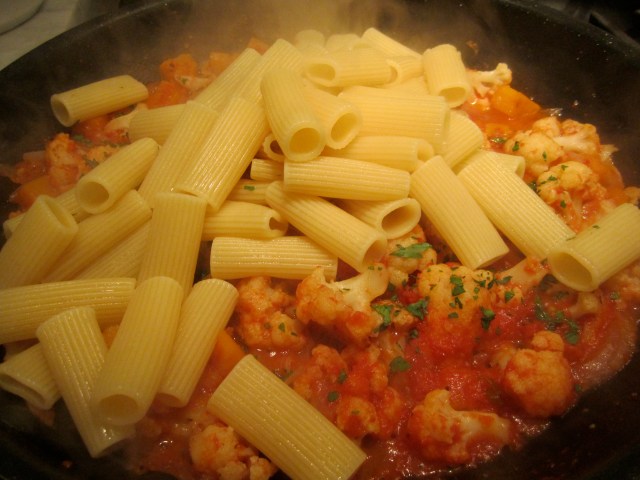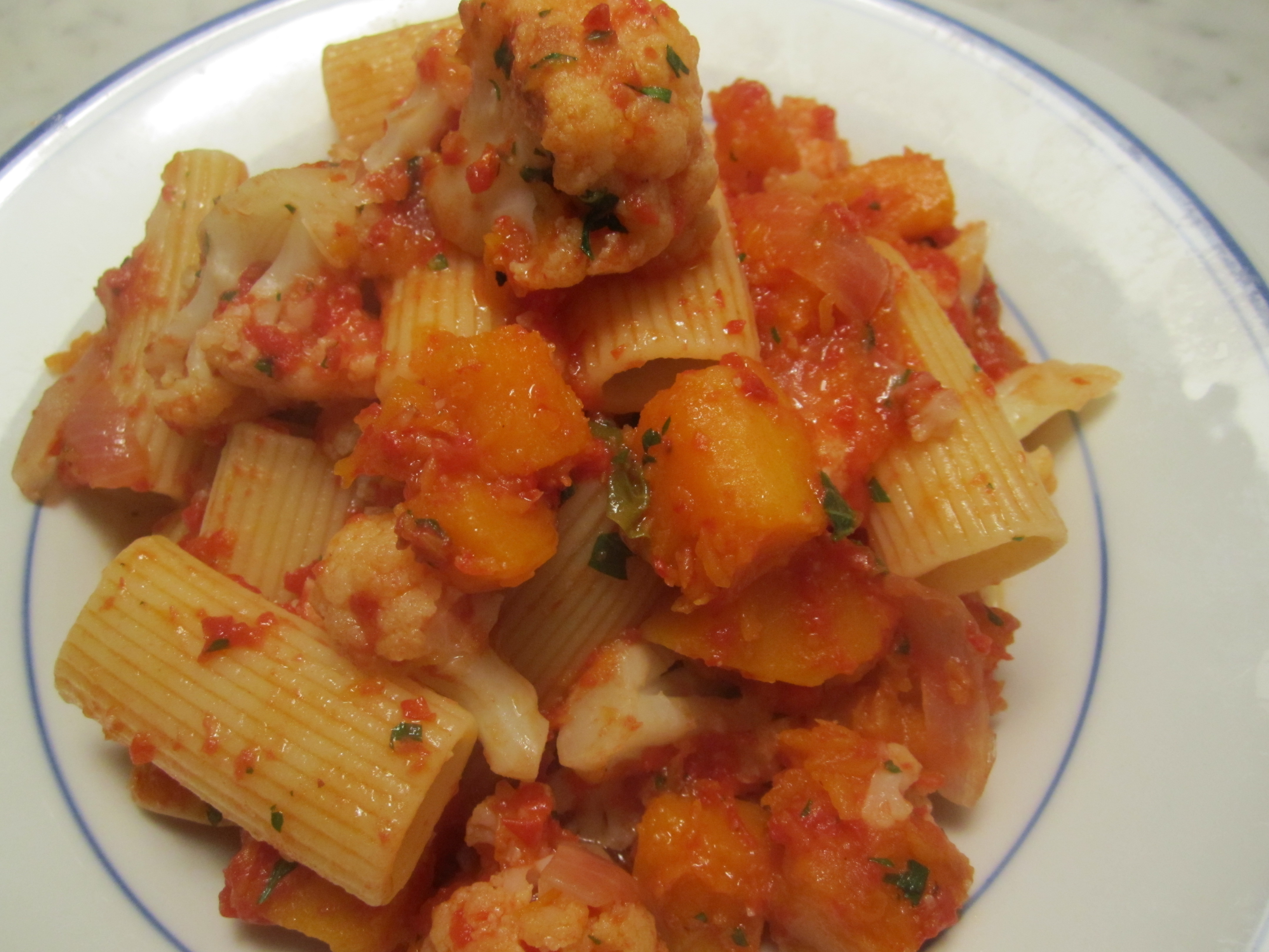 The sauce is made by sauteing bite-sized pieces of cauliflower, butternut squash and onion until tender and lightly caramelized. Pureed tomatoes are added and the sauce is simmered until the pasta is cooked and added. The vegetables should be tender and melting.