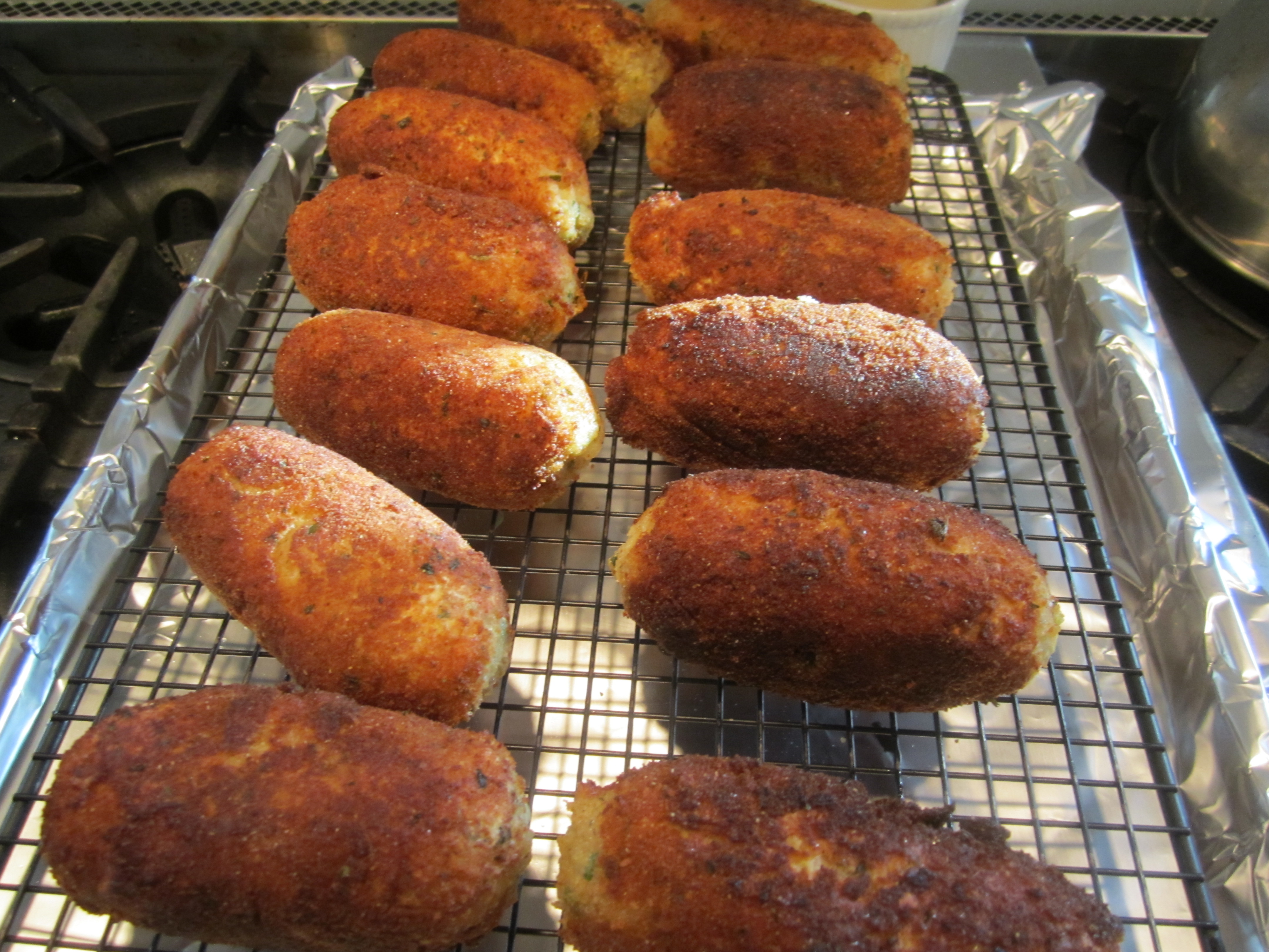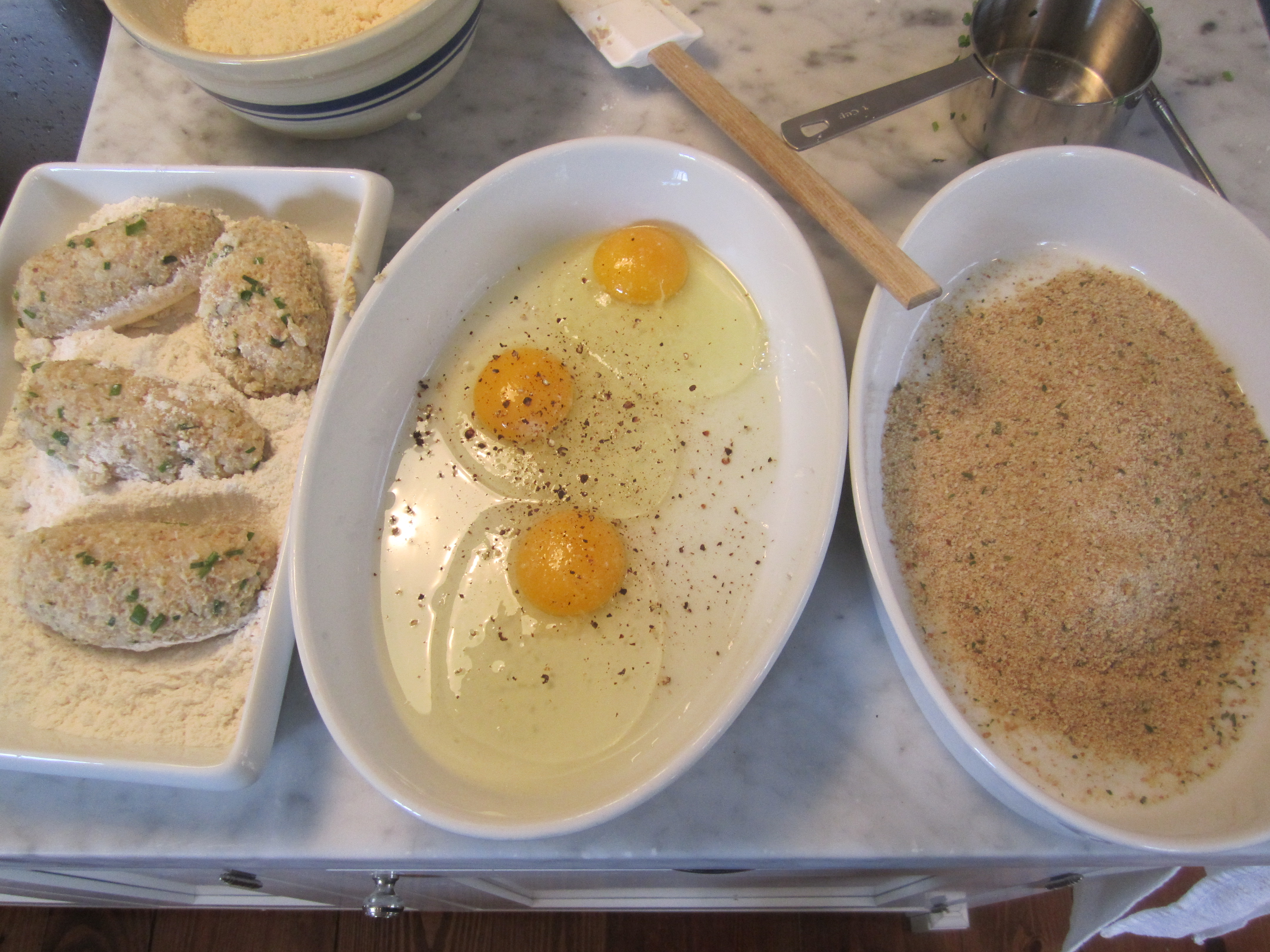 Form into logs approximately 4″ long and 1 1/2″ thick. Dredge in flour, 3 beaten eggs seasoned with salt and pepper, and crumbs.