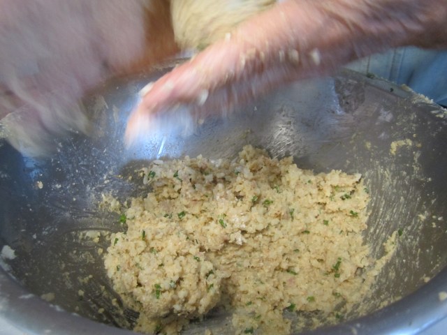 Having said that, bear in mind that the risotto you use as your base might be more or less liquidy, depending on how much broth you added. Last night’s risotto was definitely moist but not too soupy. When risotto cools in the fridge, it always turns into a solid mass, so it’s important to remember how runny it was when you served it–that will dictate how much breadcrumbs you’ll need to give the croquettes the proper consistency.