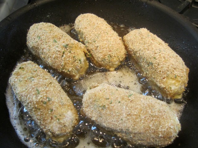 Preheat oil in a nonstick skillet large enough to hold only about 6 at at a time (10″). Gently slip croquettes into hot oil, then lower the flame. Test the oil with the tip of one before slipping it in–it should begin to sizzle immediately–if not, continue heating oil before adding croquettes.