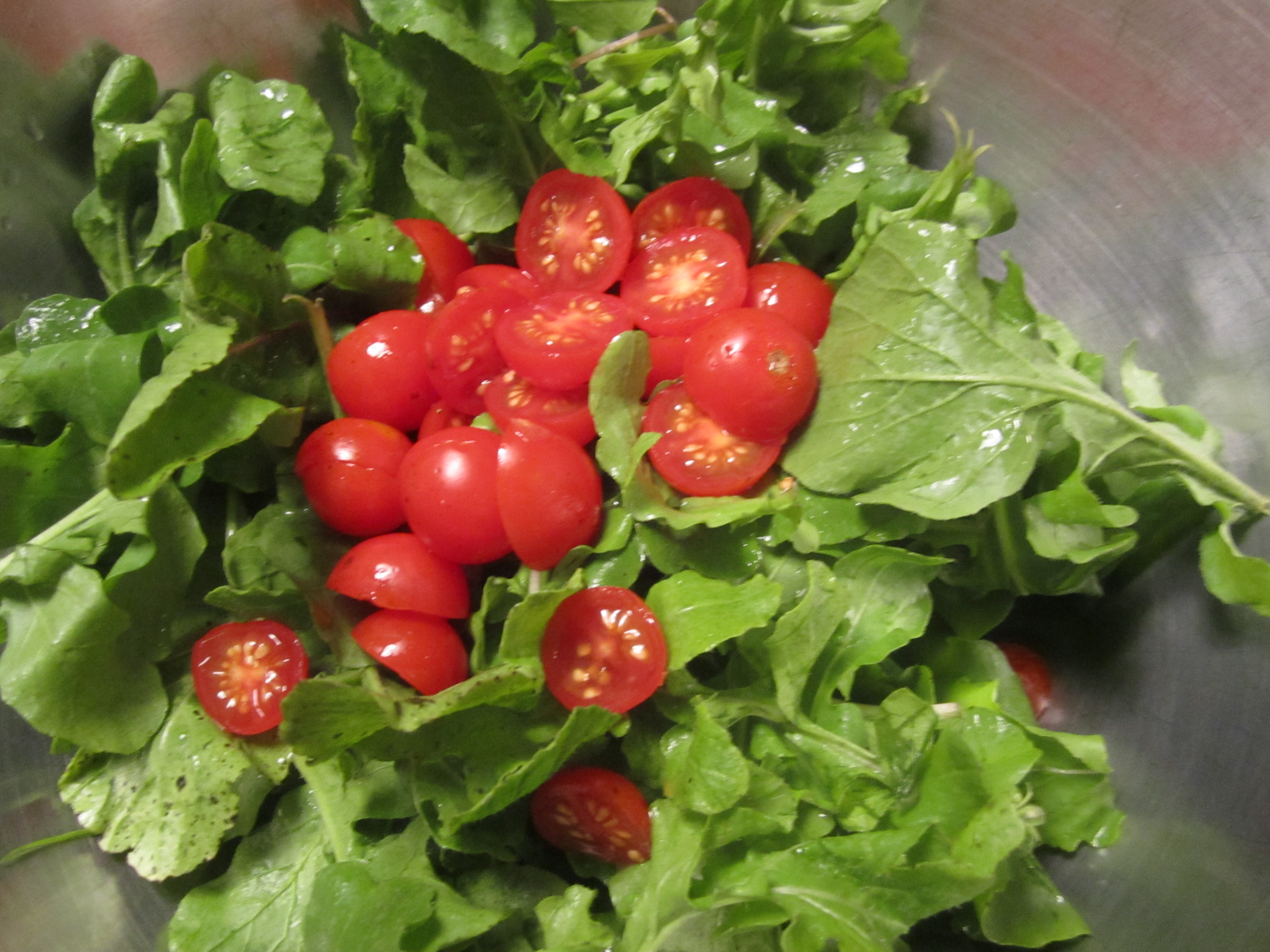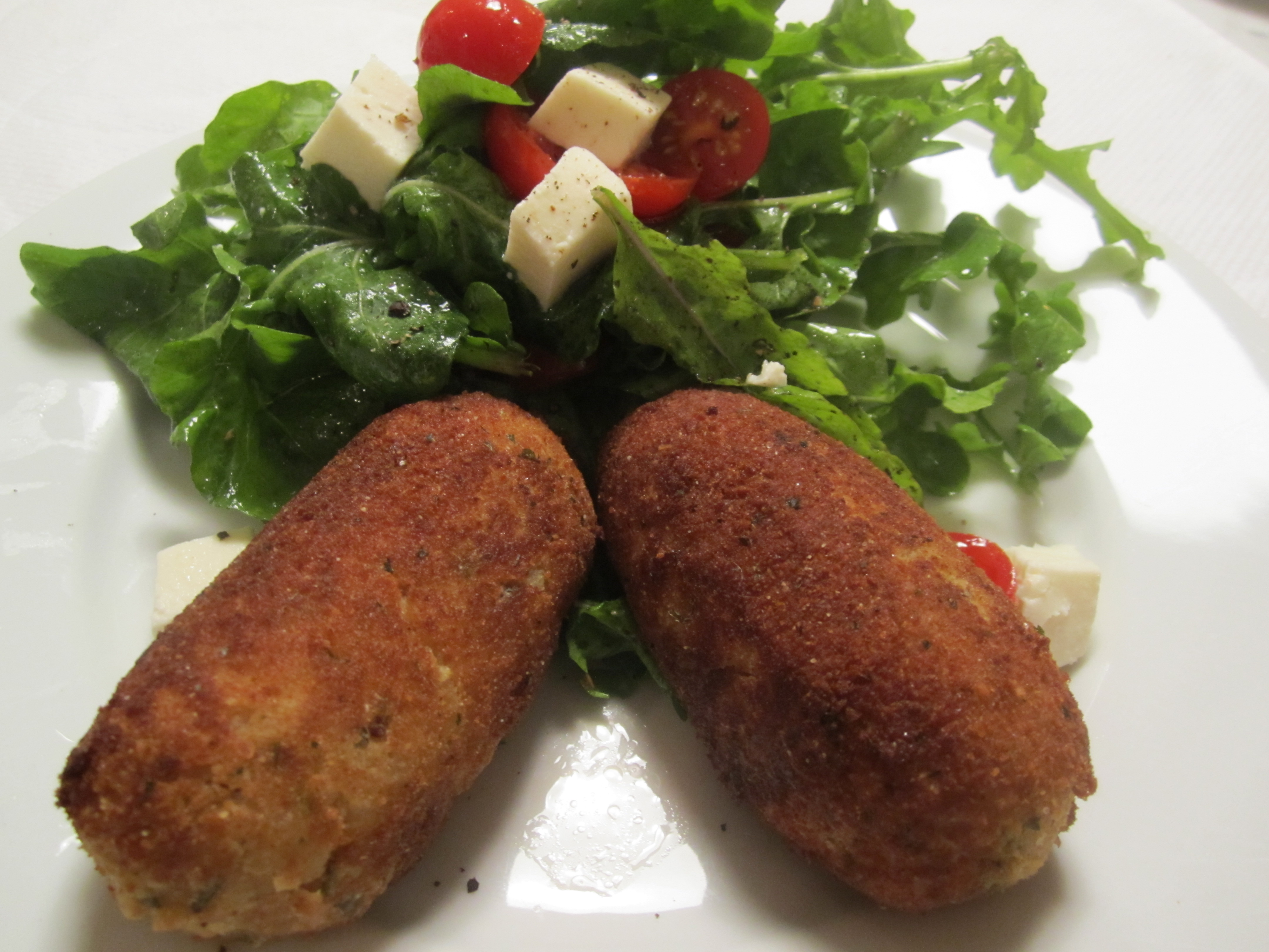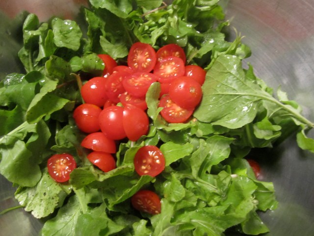 Tonight, we’re having the croquettes with a salad of arugula and the last of the cherry tomatoes from Beppi’s garden. Fall arugula is extra-peppery and is a wonderful counterpoint to the rich croquettes.