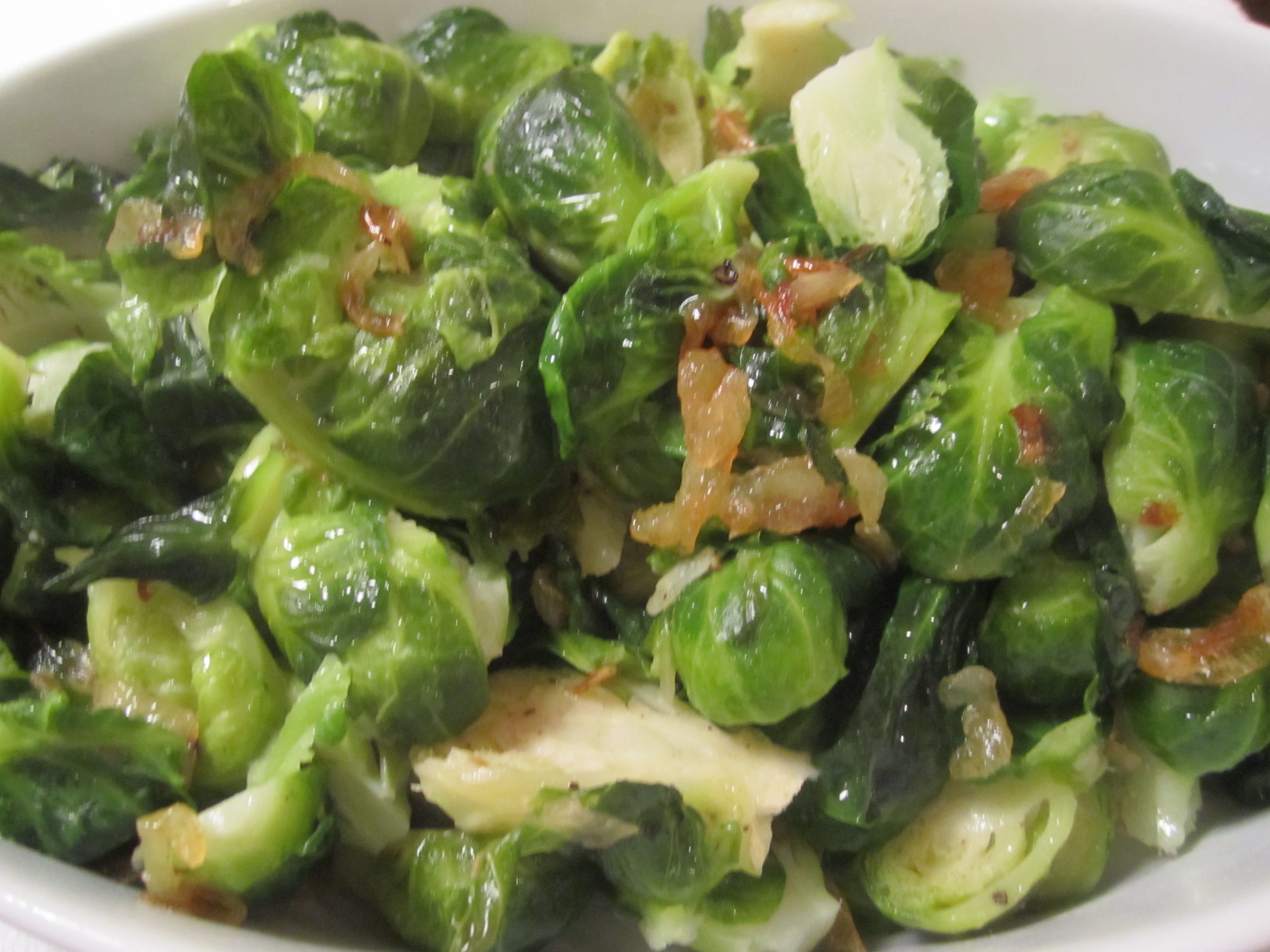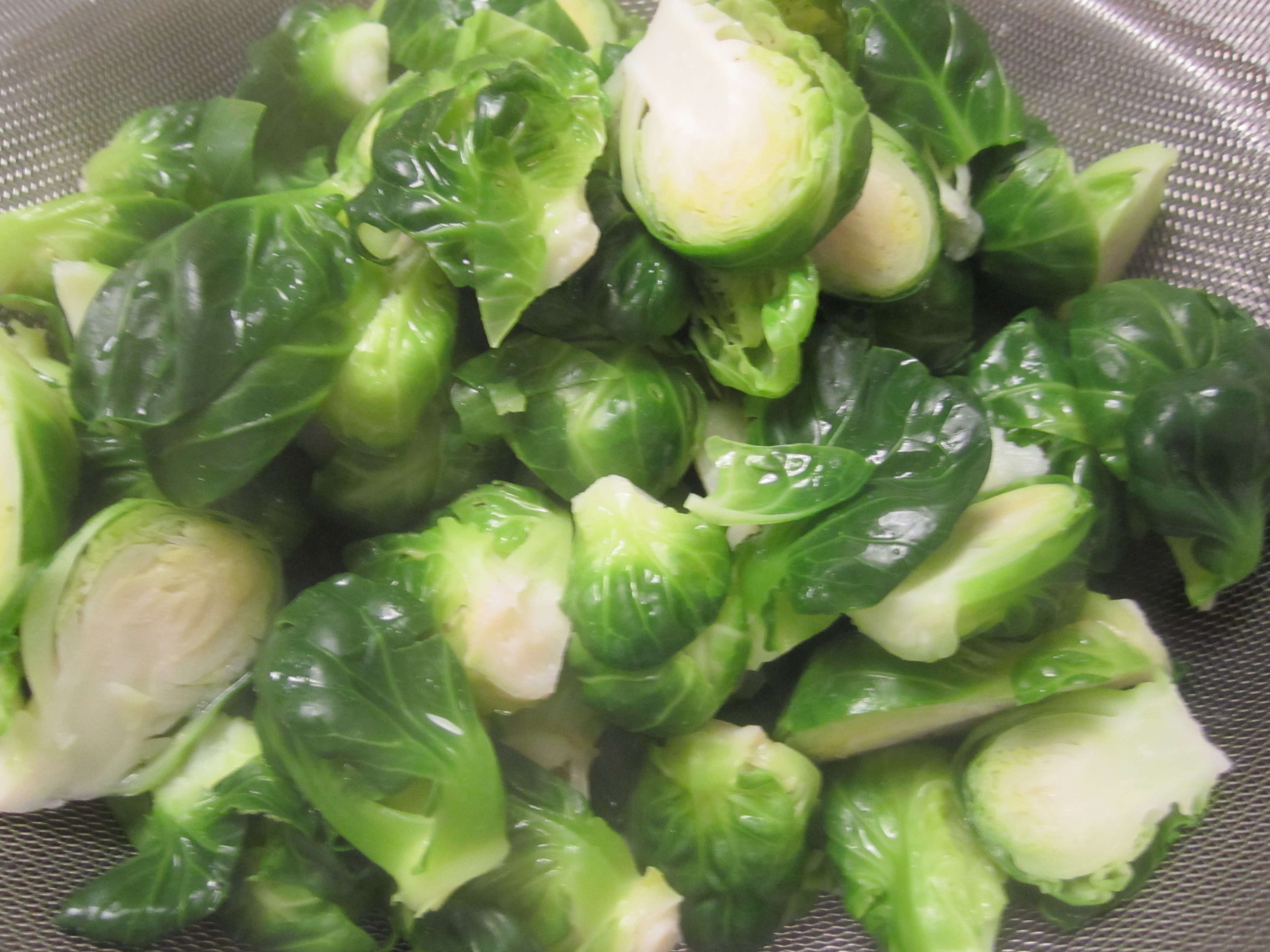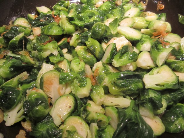 Brussels sprouts are added to the skillet and sauteed for about 3 – 4 minutes, salt and pepper are added prior to serving.