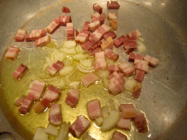 1/4 lb slab bacon, sliced thick and cut into lardons