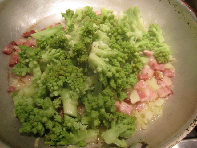 Cook on low until bacon has begun to render and shallots have begun to turn golden. Add broccoli to the skillet and saute for about 3 – 4 minutes on medium heat.