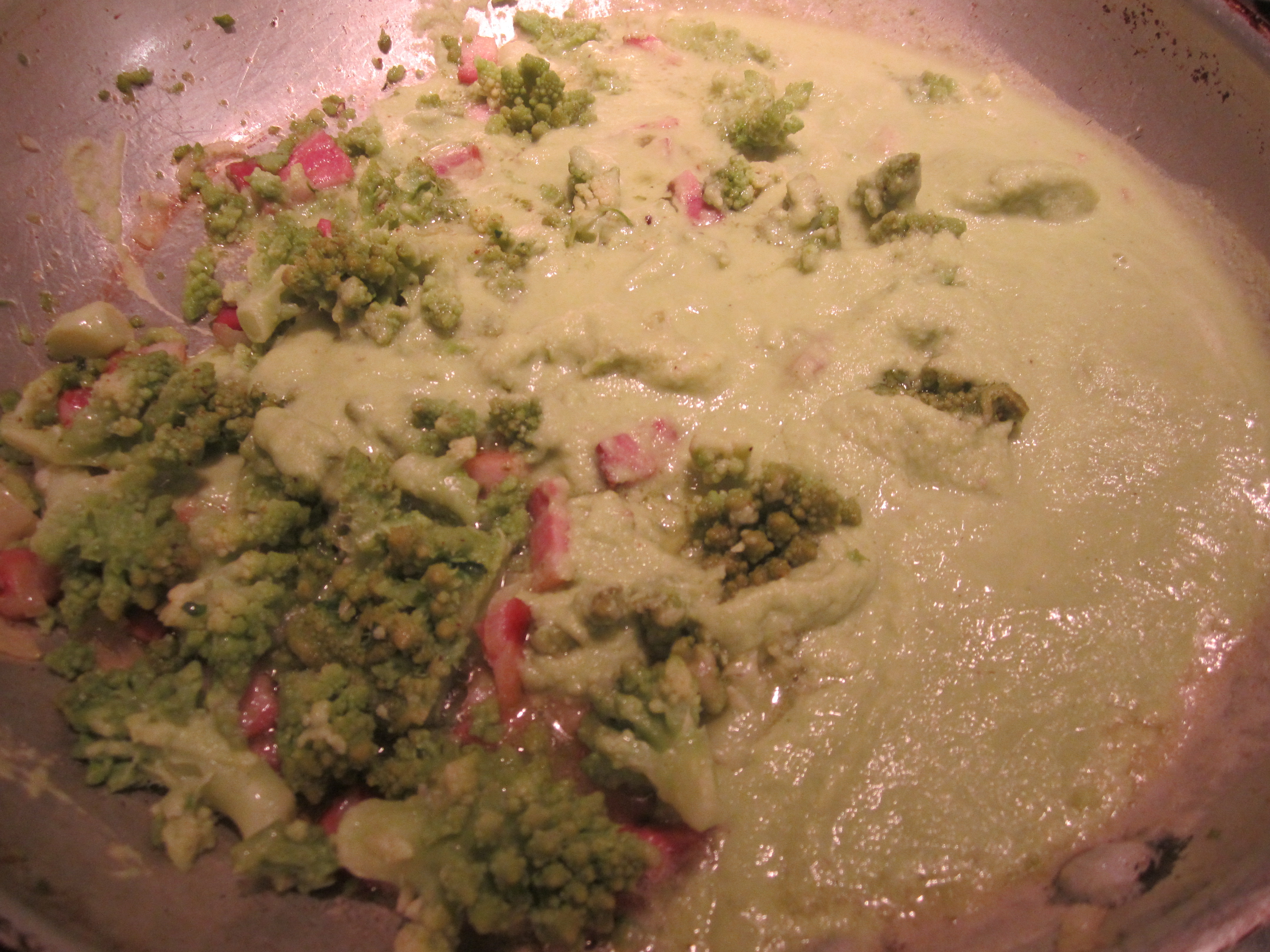 This version is a spinoff of my recipe for cavatelli with creamy broccoli. The sauce is actually a puree of vegetables (with a little bacon for deep, smokey flavor). I’ve added just a tablespoon each of of flour and butter to add body to the sauce, but no cream or milk. To thin the sauce, I used a good amount of the well-salted vegetable cooking water.