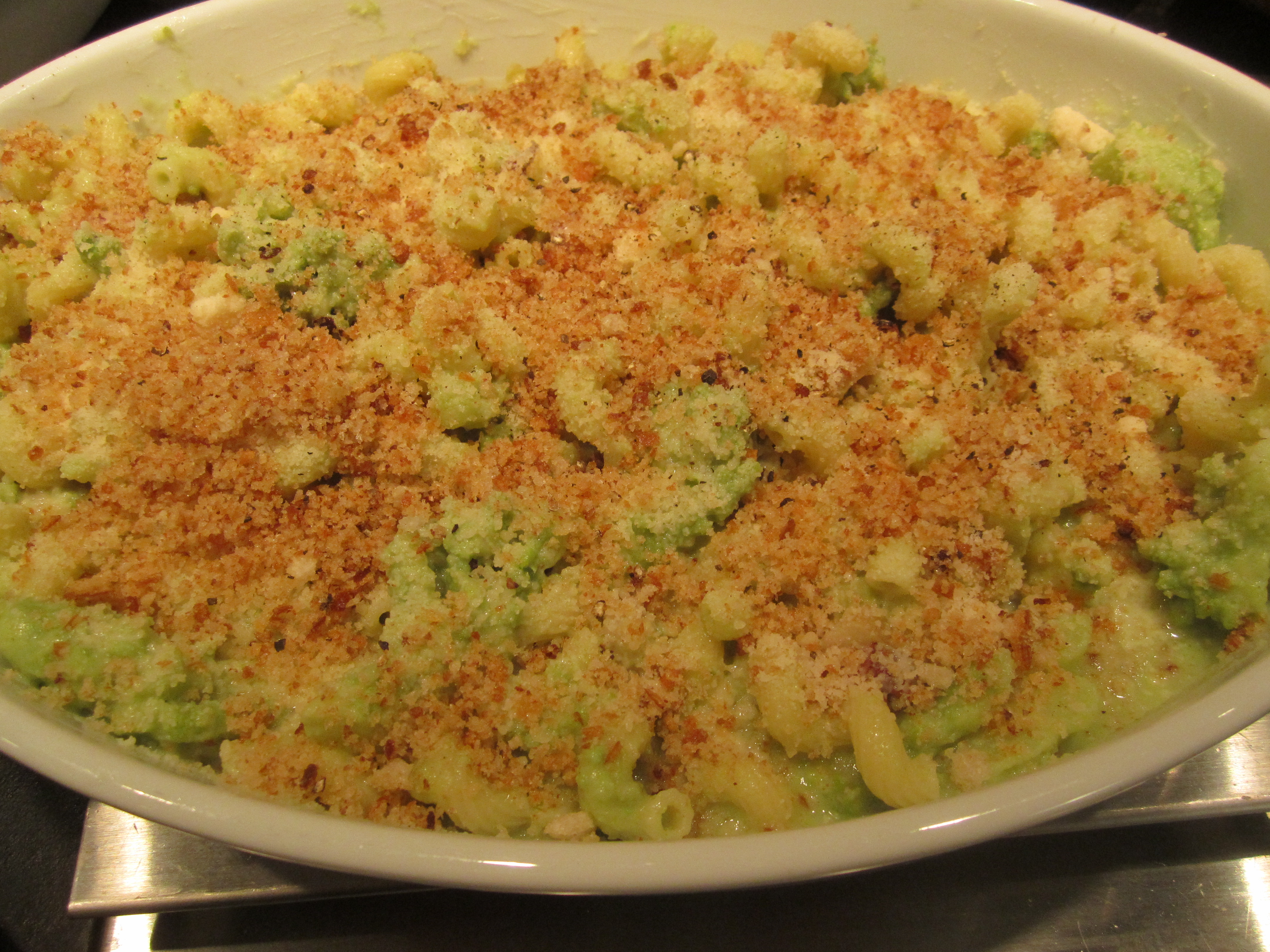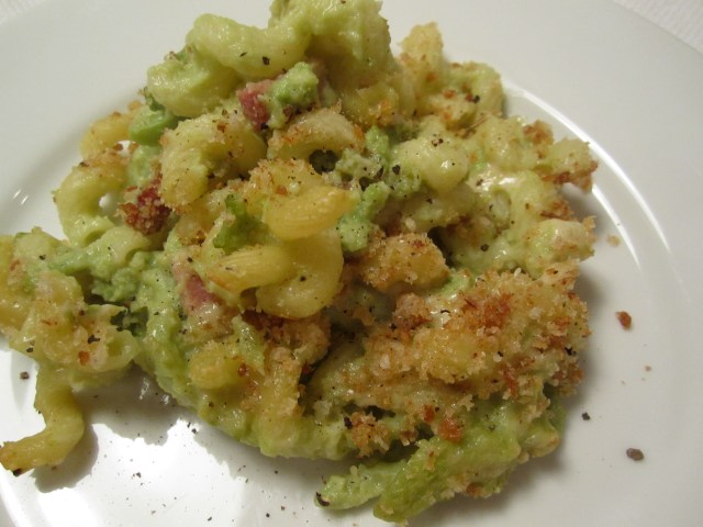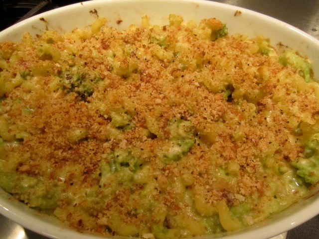 After the broccoli have been blanched and sauteed with bacon and shallots, part of the mixture is pureed, while leaving some of it whole. The partially cooked pasta is added to the skillet containing the sauce, then the whole mixture is folded into a baking dish and scattered with toasted breadcrumbs (for the breadcrumb recipe, see my romanesco broccoli with toasted breadcrumbs, although any plain toasted bread crumbs will do), along with a generous half-cup of grated parmigiano cheese. The dish gets baked at 400 degrees until toasty and bubbling.