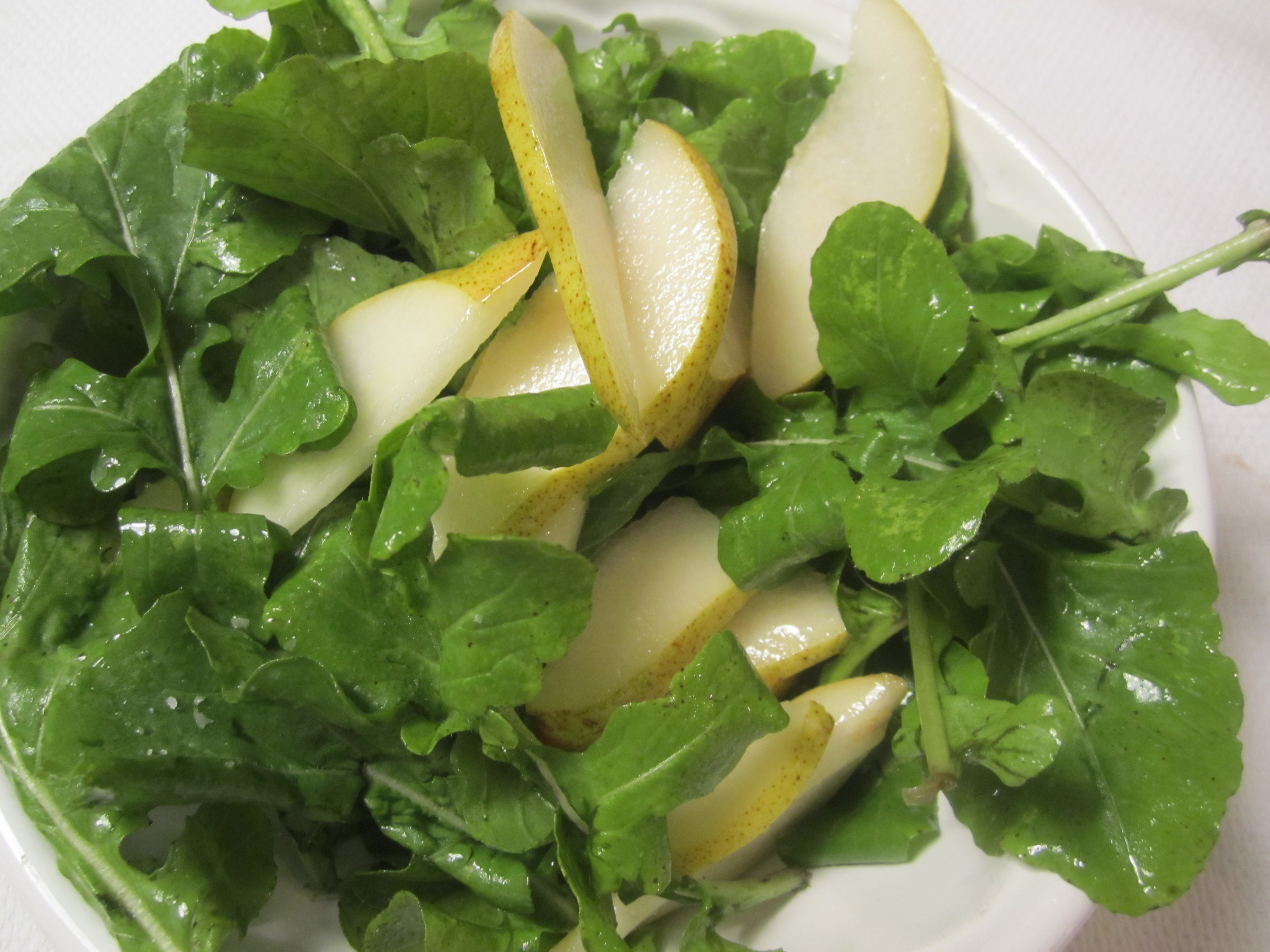 Like most baked pasta dishes, this is substantial enough to be the main course. Tonight, the only thing necessary to round out this meal was a refreshing salad of local arugula and pears, dressed with olive oil and lemon–the perfect raw, crunchy/sweet palette cleanser, served after the pasta.