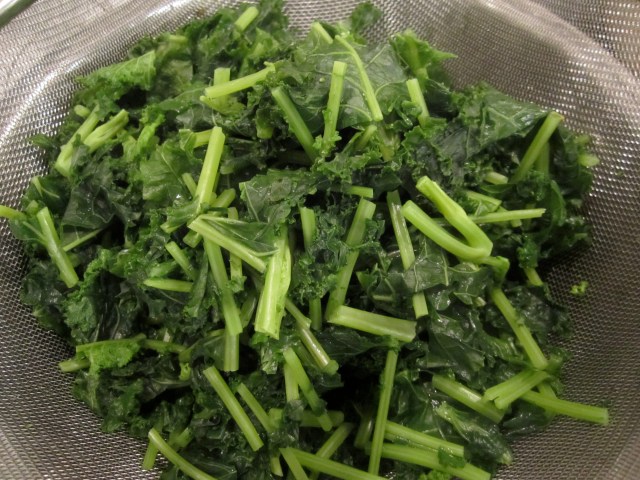 Wash and slice kale crosswise into 1″ lengths and drop into well-salted boiling water. Cook for about 7 – 10 minutes. Drain and set aside.