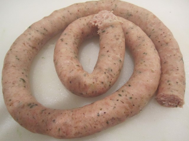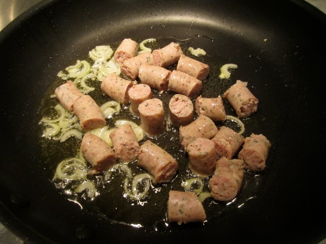 I simply slice the kale, boil it in heavily salted water, drain and set aside. After I remove the kale, in the same water, I boil the sausage (tonight, it’s chicken sausage), then let set aside.