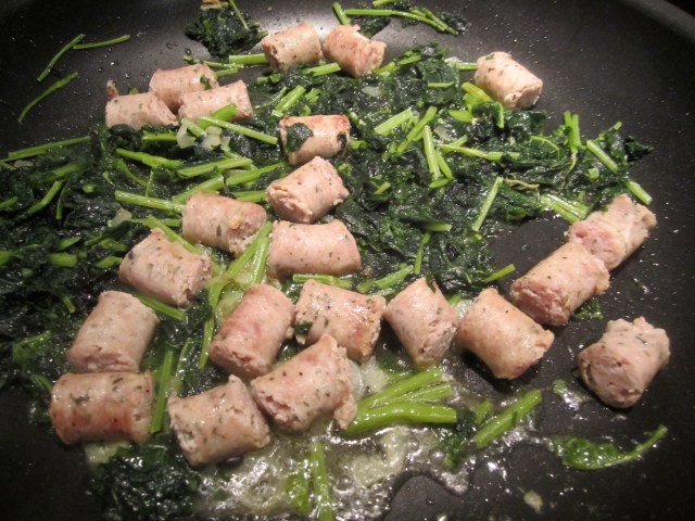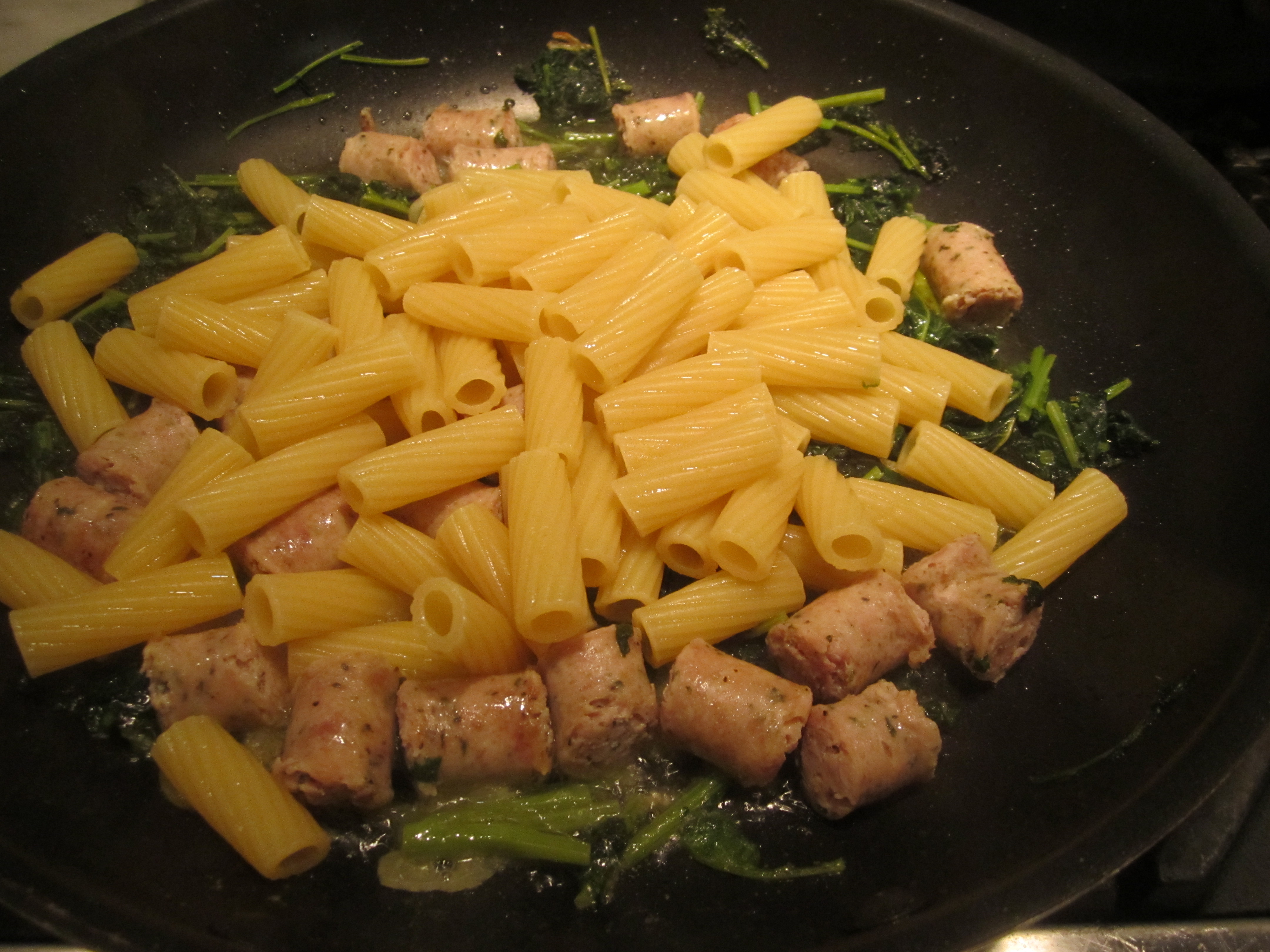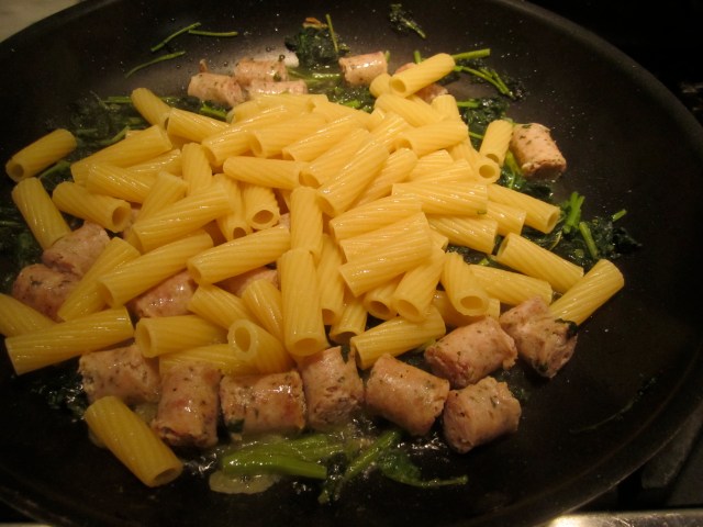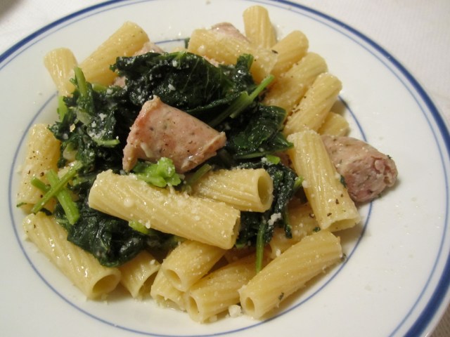While the pasta is boiling, I brown the sausage (very lightly), then add some sliced shallot and kale and saute until the pasta is cooked. I toss in the pasta, along with some cooking liquid and raw olive oil. I serve this dish with plenty of grated pecorino romano cheese and black pepper.