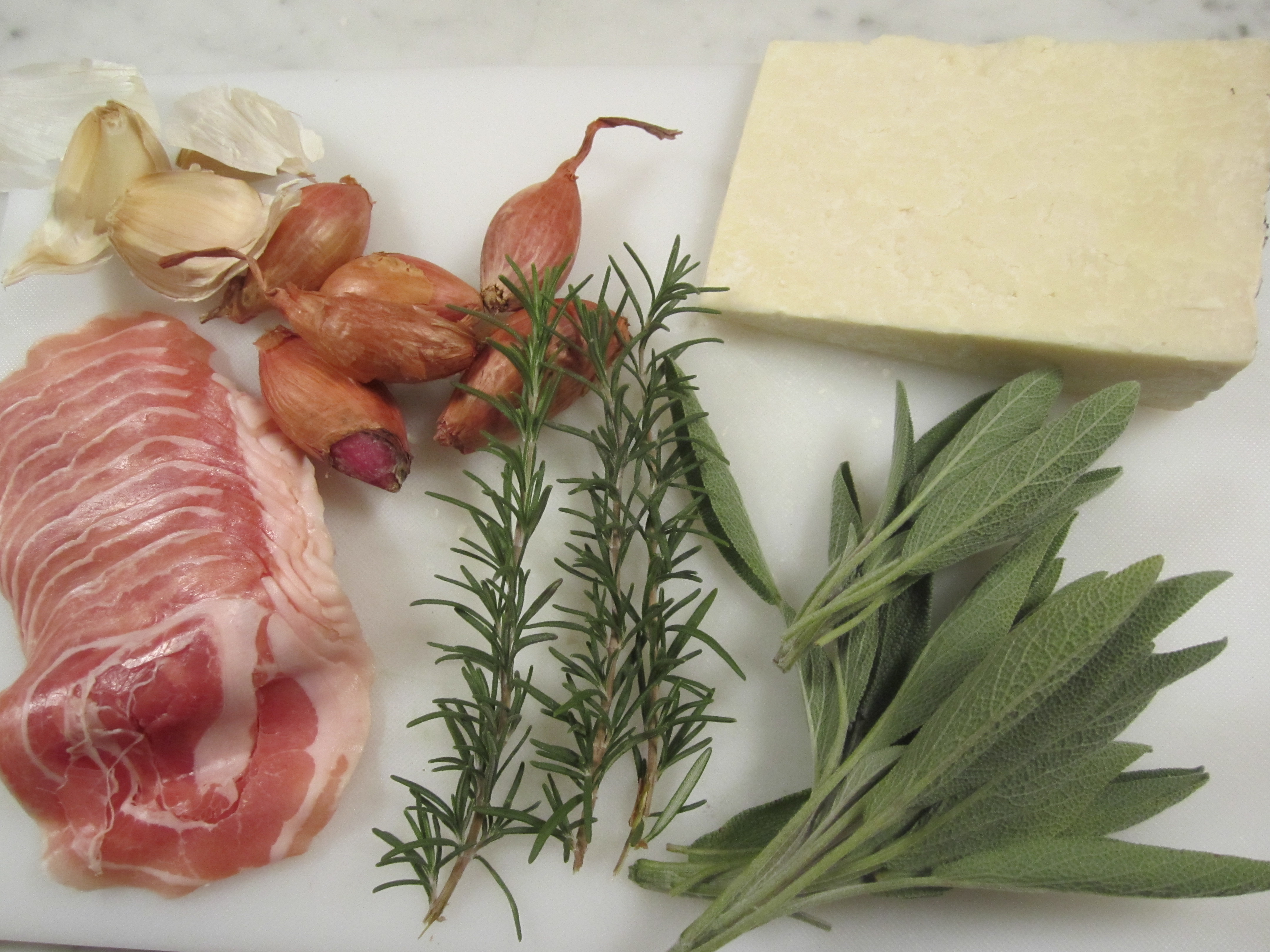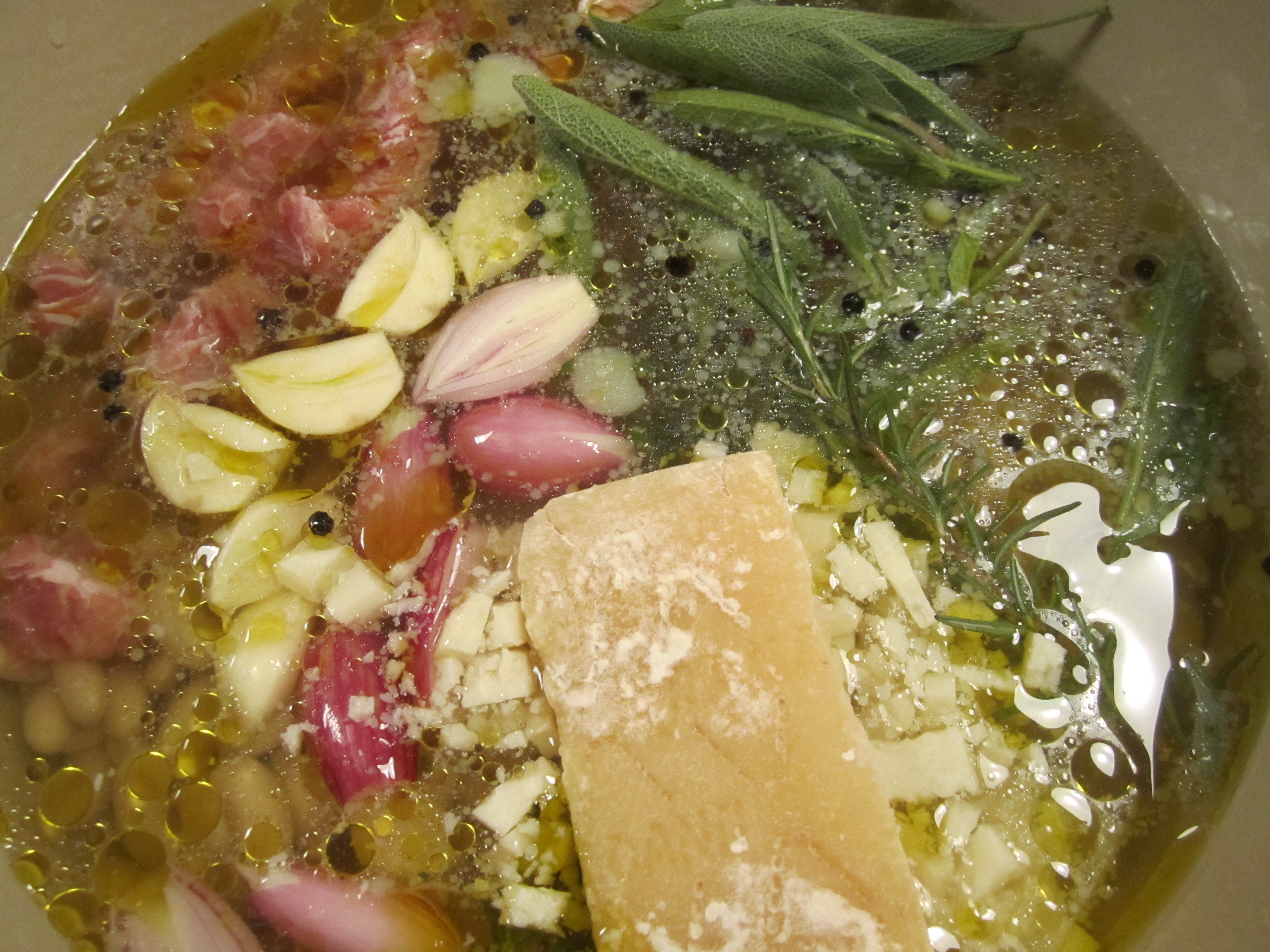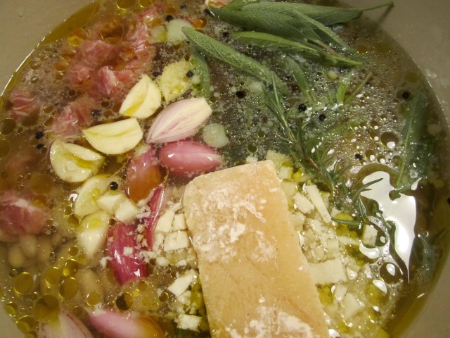 After soaking and draining, the beans are placed in a pot of salted water or broth (I’m using the cooking liquid from my kale the other evening–it made a brilliant broth). In addition, whole cloves of garlic, whole shallots, sprigs of rosemary, sage leaves, whole black peppercorns, parmigiano rind, and diced pancetta are added. The whole pot is brought to a simmer, then placed in a 300 degree oven for about 2 hours. A portion of the beans are then removed, pureed and returned to the pot. This makes for a salty, creamy, herbaceous soup that is great with some pasta or by itself with some bruschetta.