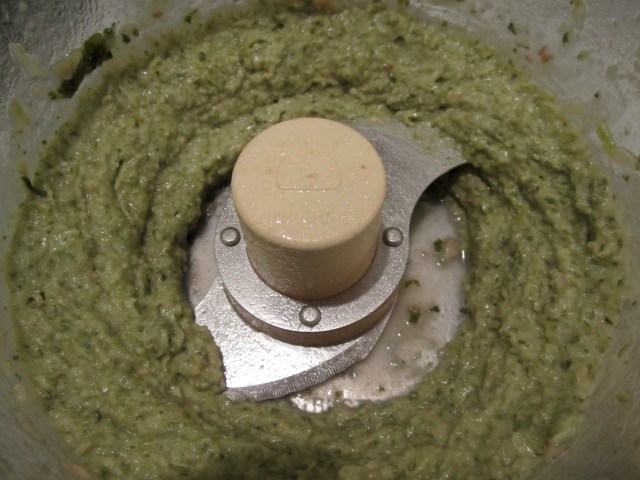 Remove beans from oven and drain them in a strainer, keeping all the liquid in a separate bowl. Remove rosemary branches (leaving the stray needles in). Place 2 cups of beans in the food processor (include some rosemary and sage leaves) along with 1/2 cup cooking liquid. Process to a smooth puree.