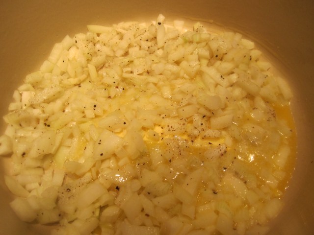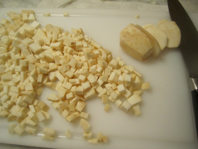 In an 8-quart dutch oven on medium heat, saute celery root and onion (with a sprinkle of salt and pepper) until they begin to turn golden (about 10 minutes on moderate heat).