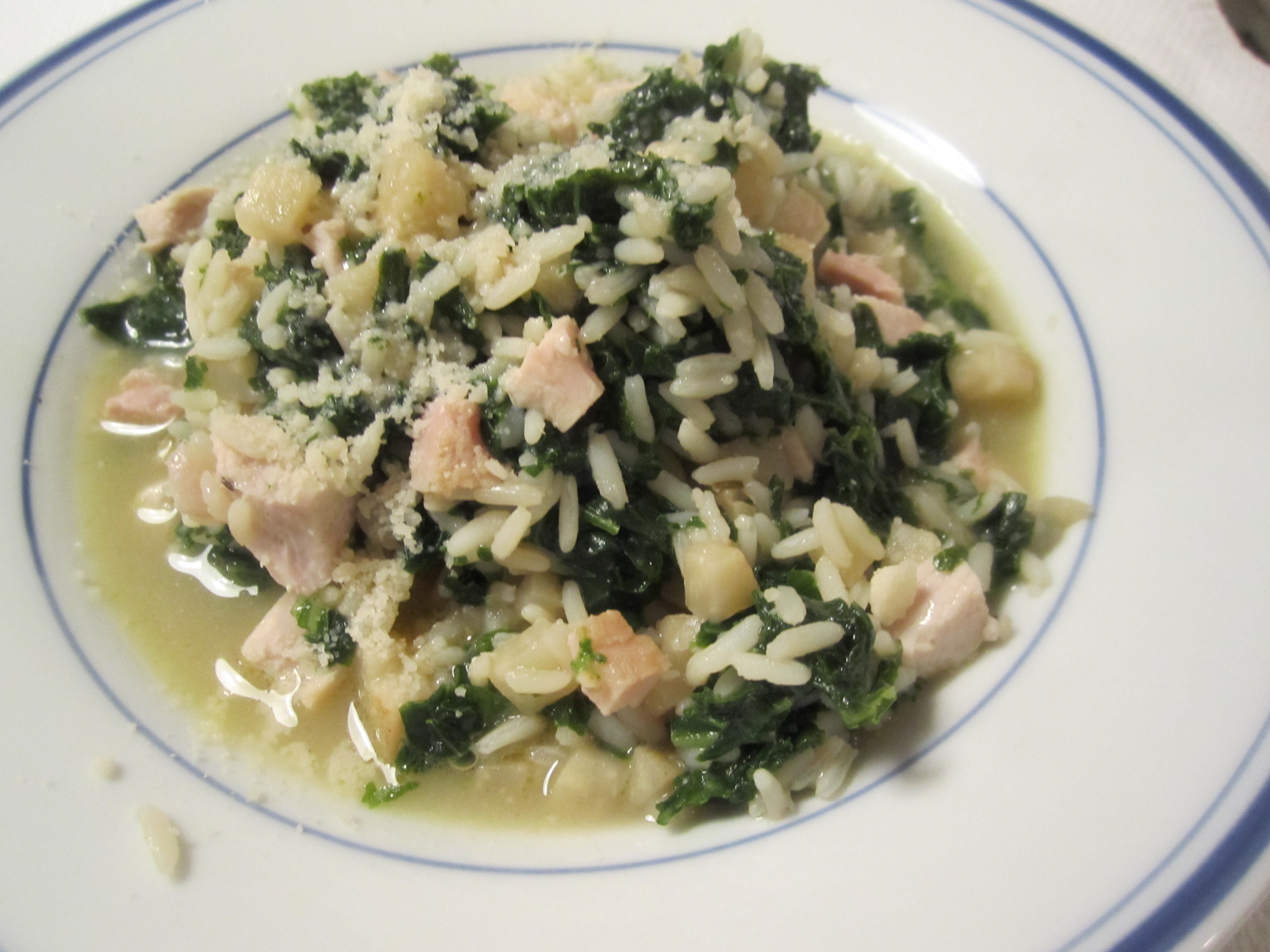 Tonight, I used Beppi’s soup as a base for our one-pot meal. The celery root and rice soup by itself, would be a great first course, but tonight I wanted the soup to be our dinner. I happened to have the perfect additions in my fridge to fortify this soup–turkey and kale. The turkey was from my brined turkey breast the other evening–it was salty and flavorful–almost like a piece of cured sausage. The kale, I had cooked and frozen a few weeks ago, since I always cook large amounts of it this time of year, knowing that it freezes impeccably. Both together, these ingredients complemented Beppi’s celery roots and rice beautifully.