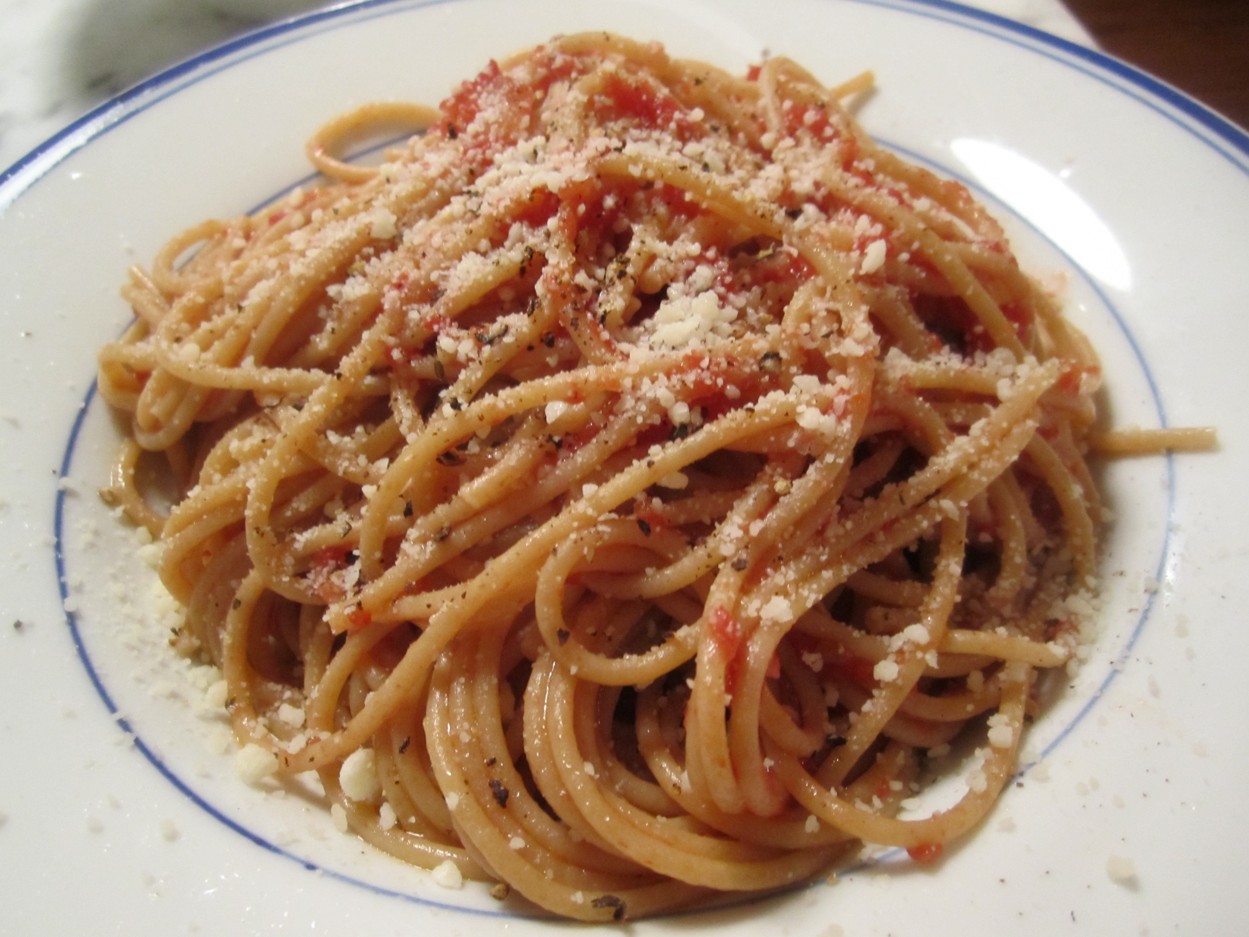 Many years ago, when I was in Italy staying at my aunt and uncle’s house for the summer, my aunt made me this dish with some leftover spaghetti. It was a revelation–she just cracked some eggs into the pasta, sauce and all, added cheese and turned the whole mass into a skillet of sizzling butter. It was so delicious, I never forgot the flavor, and I think of my (late) Aunt Rita every time I make it.