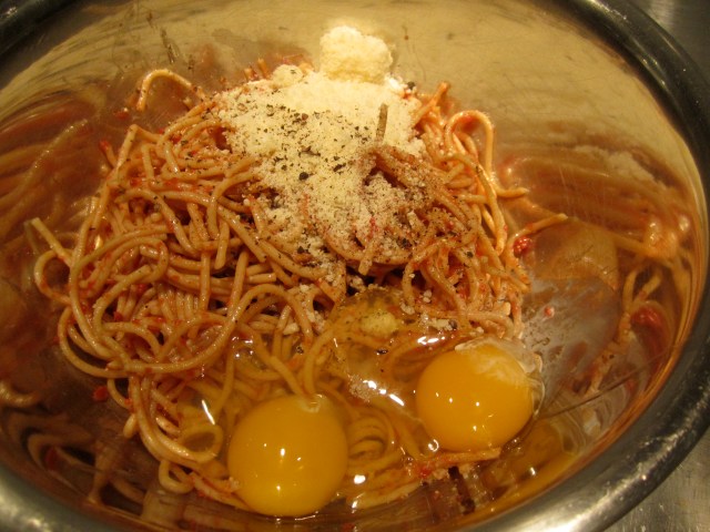 I began with about 2 cups cold cooked whole wheat spaghetti in tomato sauce. In a mixing bowl, I added 2 large eggs, 1/2 cup grated pecorino romano cheese, 2 tablespoons milk or half and half, 1/4 teaspoon black pepper. You could add up to 6 eggs here, depending on how eggy and creamy you want the finished dish–I happen to like it drier and crispier.