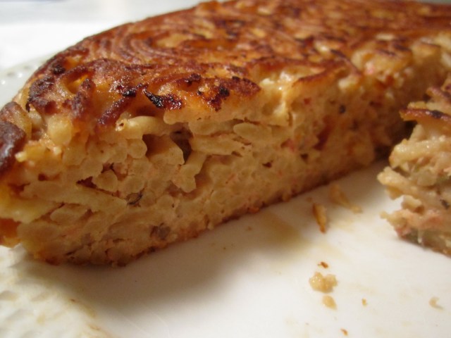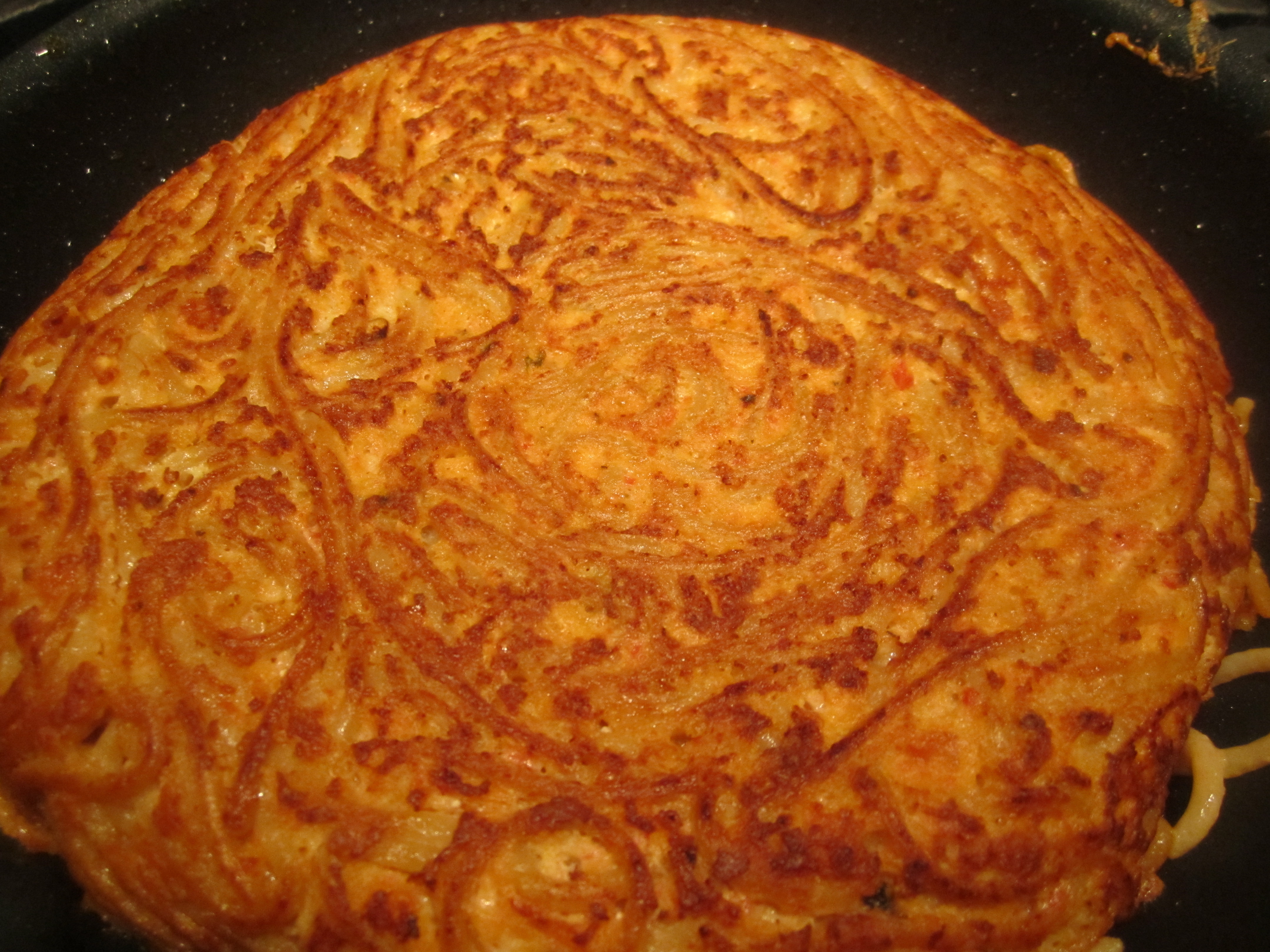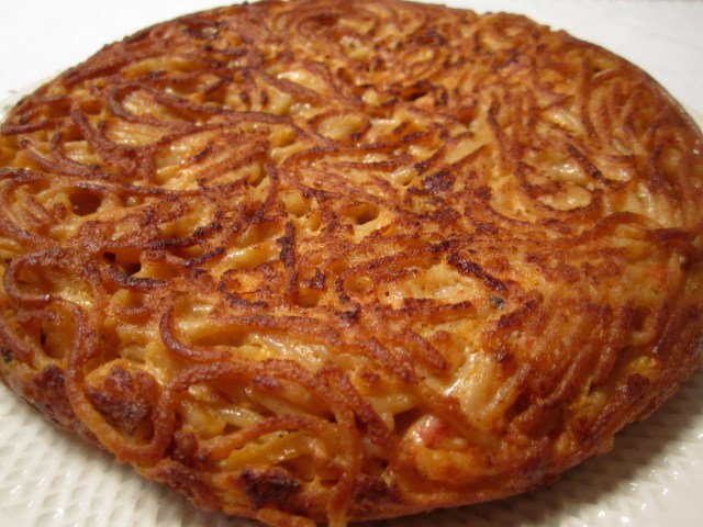 Tuck in any loose spaghetti around the edges with the spatula to ensure a nice round shape. Fry for another 6 to 8 minutes until the underside is brown and crispy. Let settle for at least 10 minutes prior to cutting. The inside will be creamy and cheesy and the outside will be crispy and nutty.
