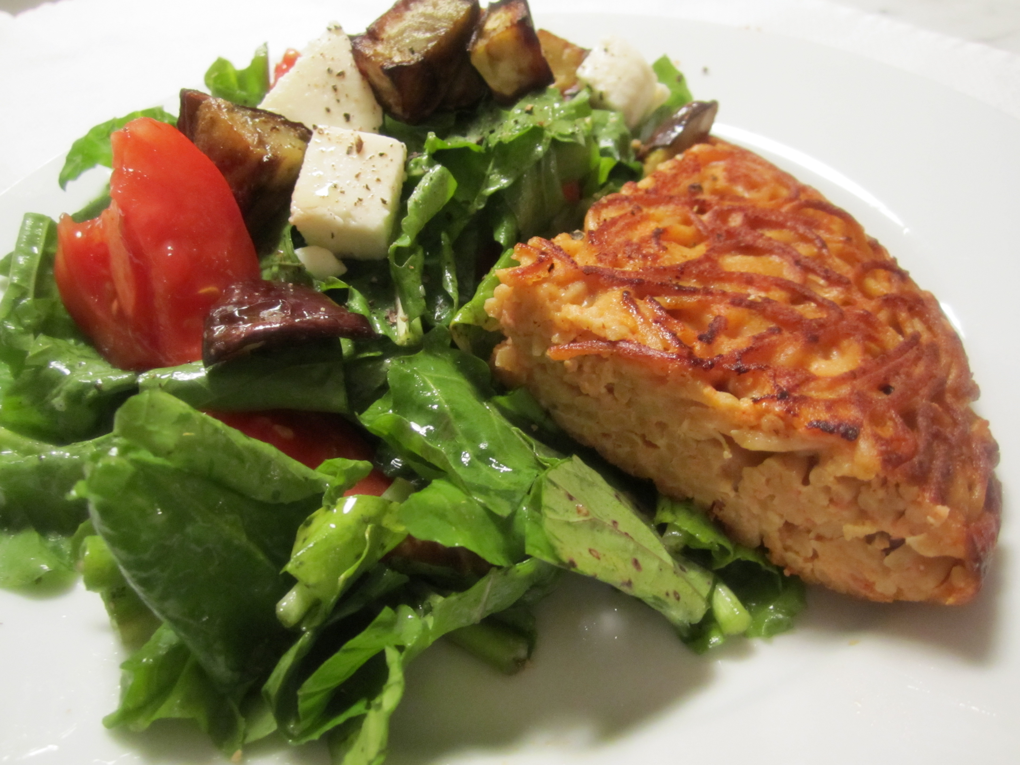 The best thing with which to serve frittata is a salad of some sort. Tonight, we had a salad of arugula, tomatoes, crispy fried eggplant and cubes of mozzarella. My neighbor Beppi surprised me with one last eggplant from his garden, so I sauteed it added it to the salad.