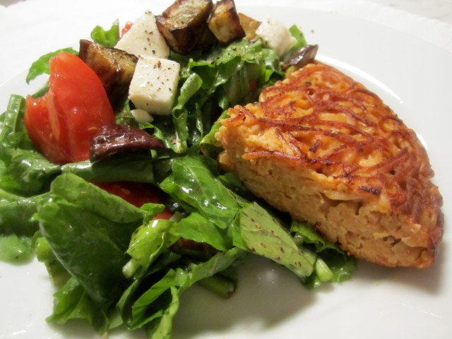 Note: the mixture must be very salty to make a flavorful frittata, so prior to adding the eggs, taste it and make sure that the salt is right. If not, add additional salt. In my case, the leftover pasta was on the salty side, therfore no additional salt was necessary.