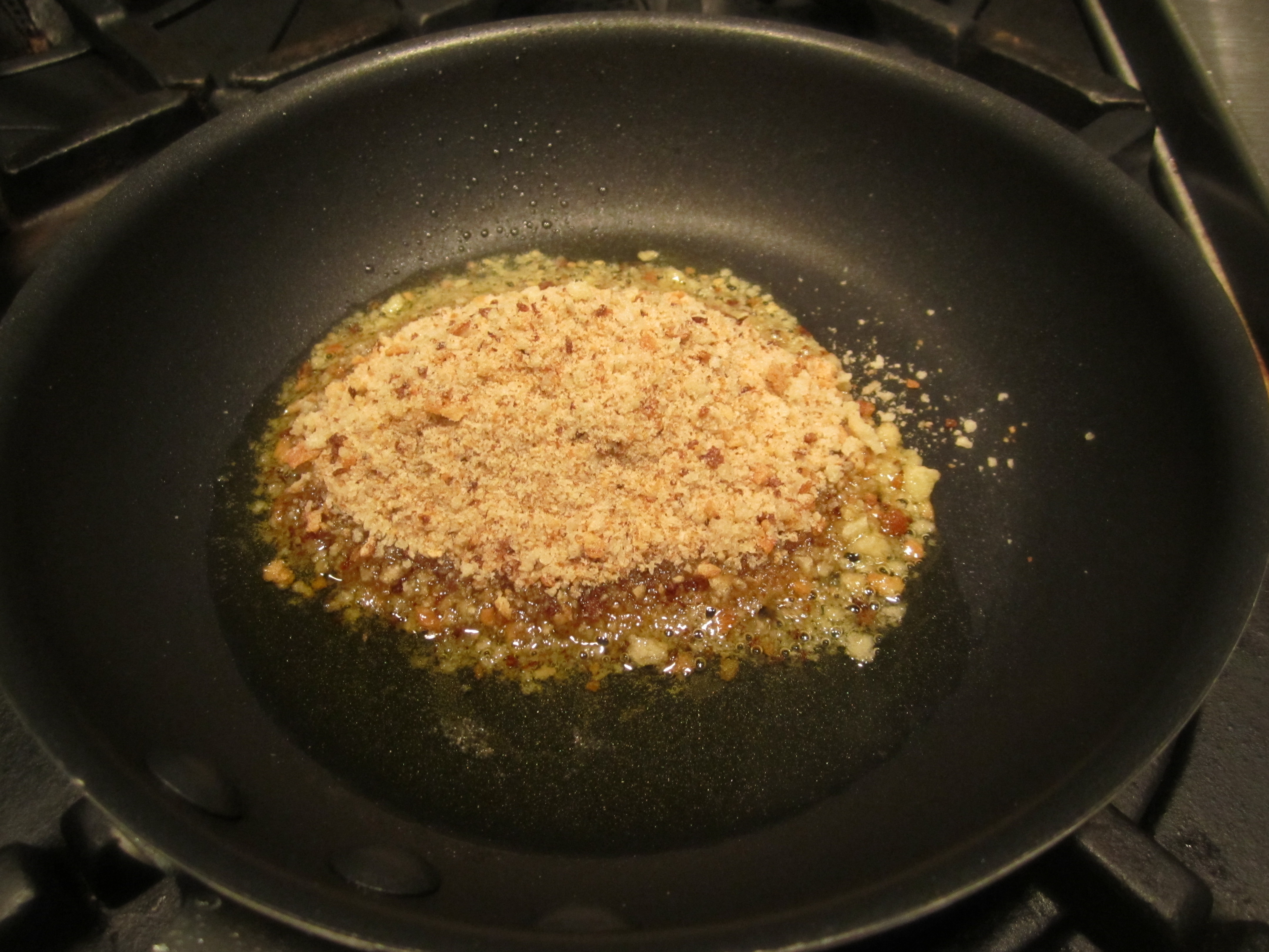 When the crumbs are golden (and not a moment longer–they scorch easily), add parsley and remove crumbs from skillet. Taste and add salt and pepper. Set aside.