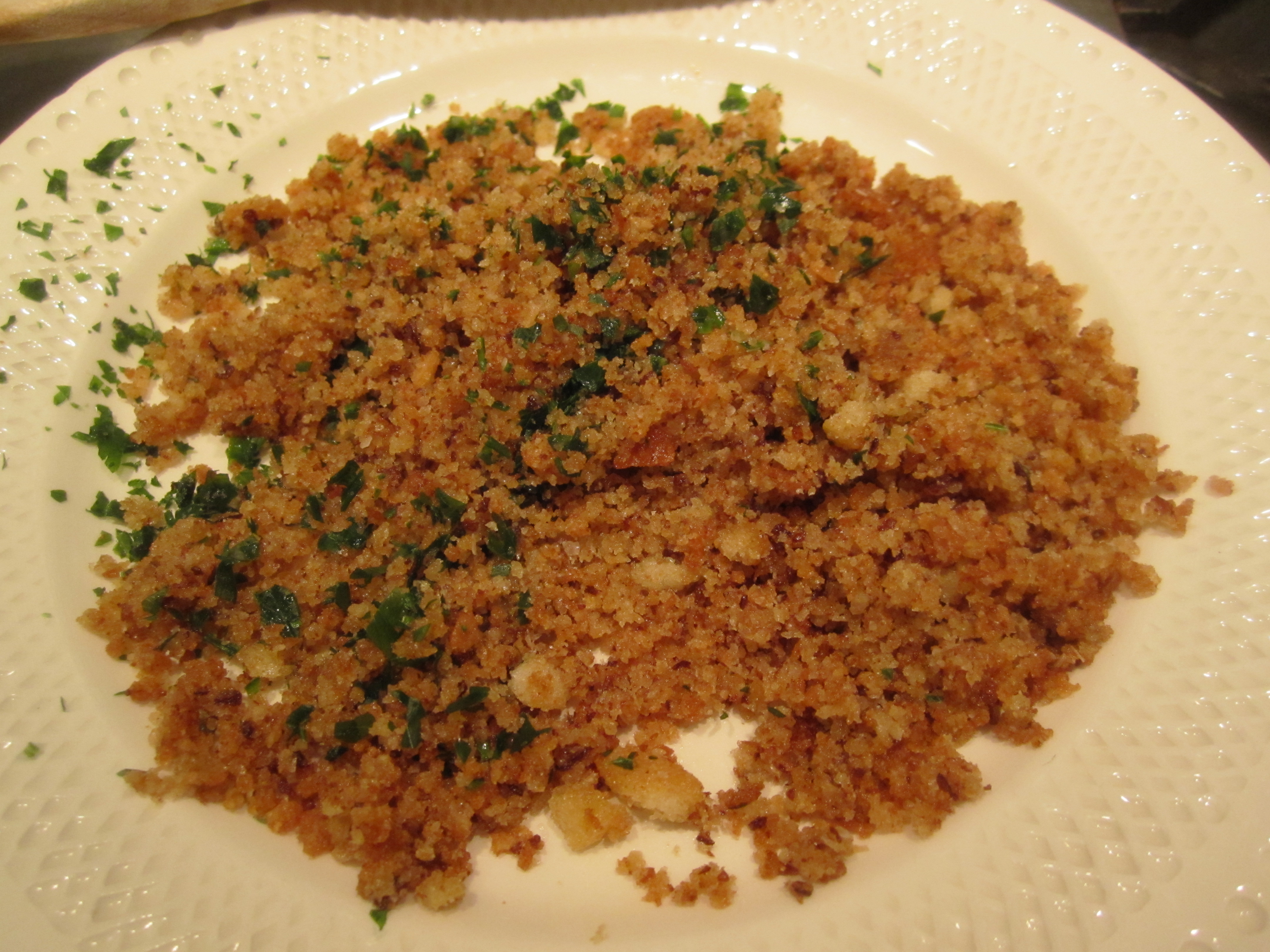 Add to that some toasted breadcrumb topping, which I made out of the ever-present pile of petrified bread scraps which sit in a bowl on my countertop. I ground the bread in the food processor and toasted the crumbs in some olive oil in a skillet, then added some fresh chopped parsley to brighten it. Finding ways to use these bread scraps also makes me extremely happy.
