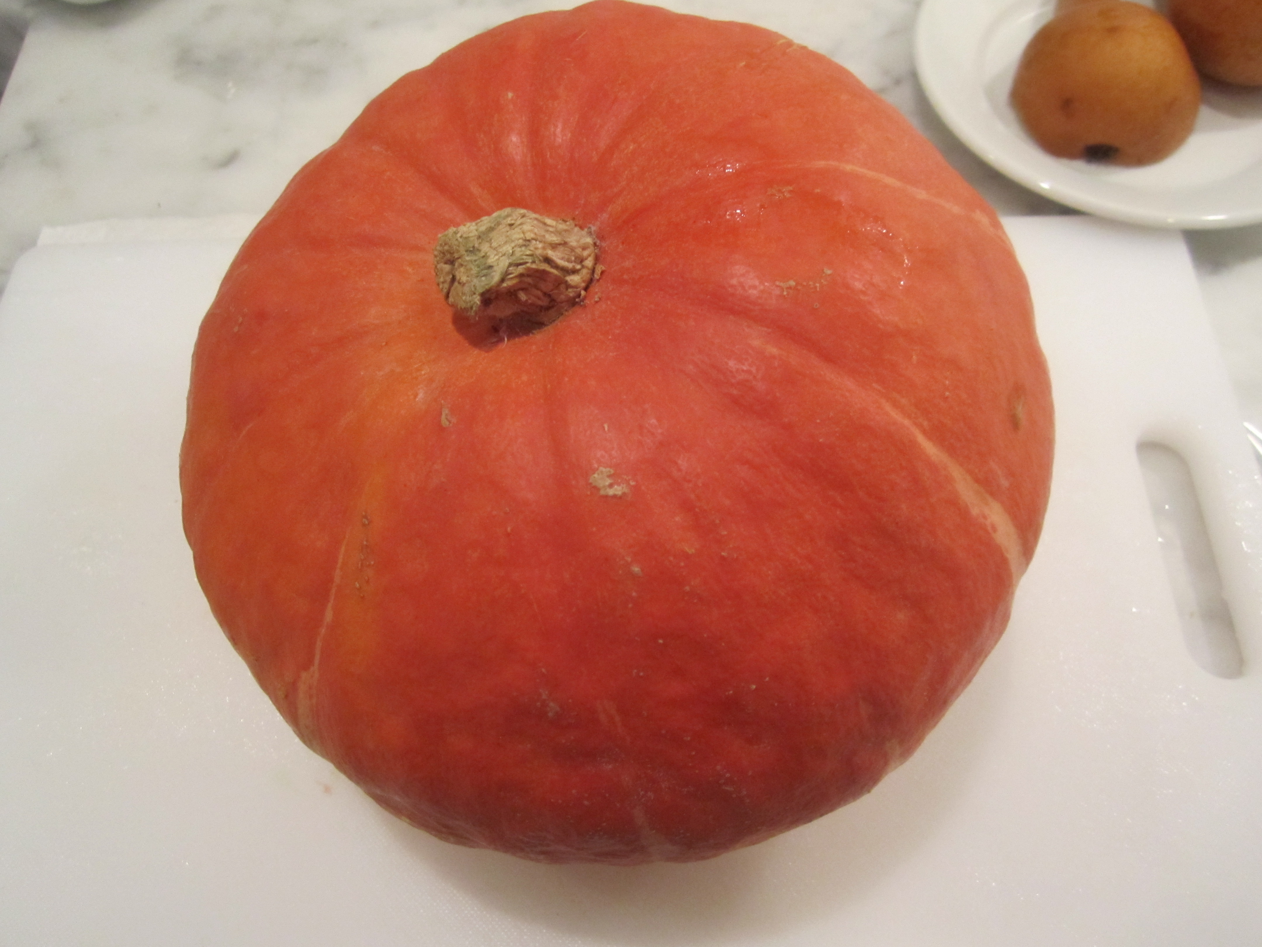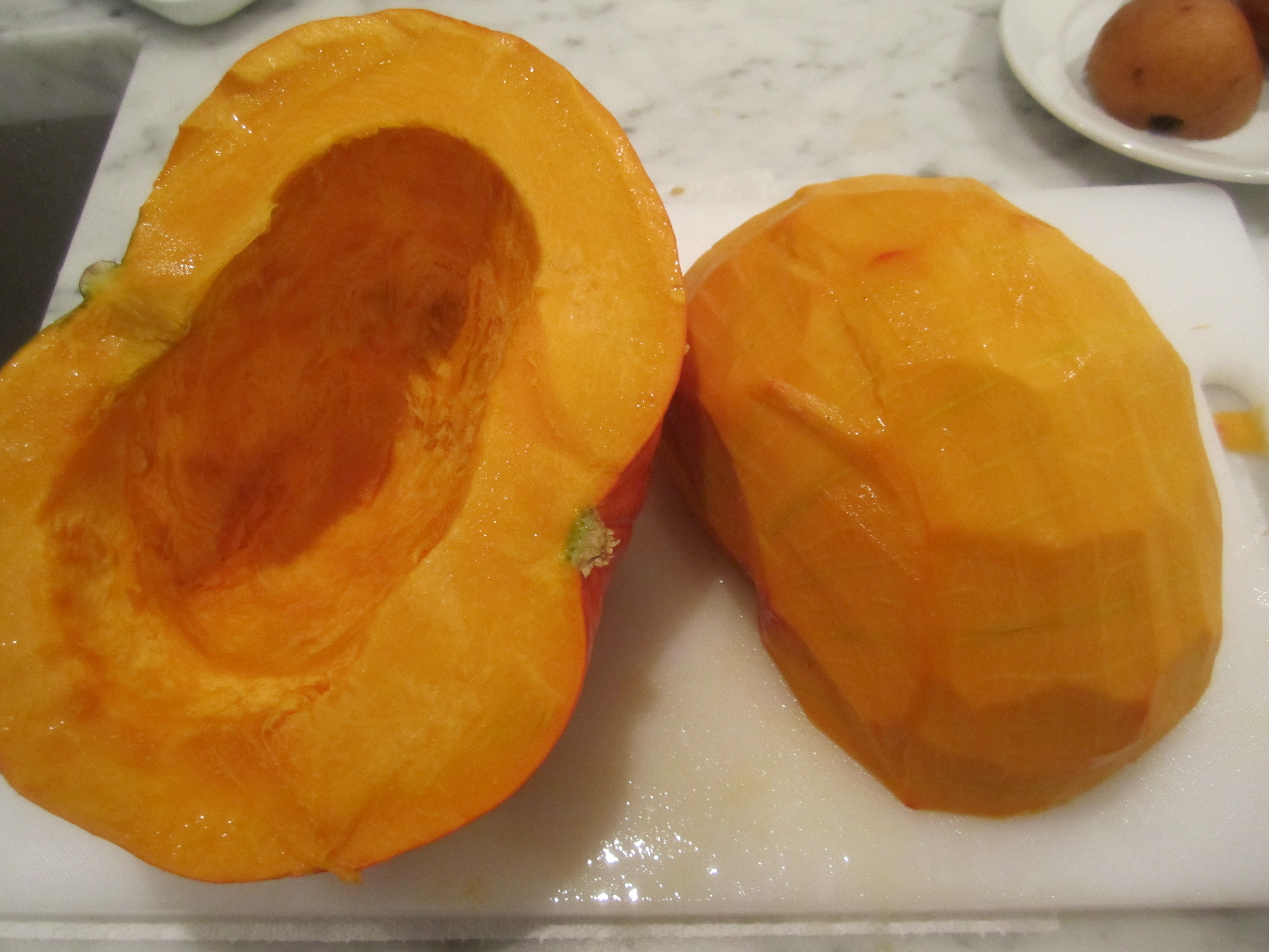 Usually, I use butternut squash, but today, I decided on kabocha, a variety of winter squash that is round, ribbed, and has either dark green or orange skin. The orange variety is also known as “sunshine squash”. It’s even sweeter and more delicate than butternut (believe it or not).