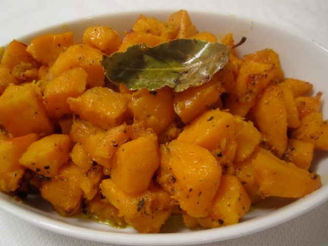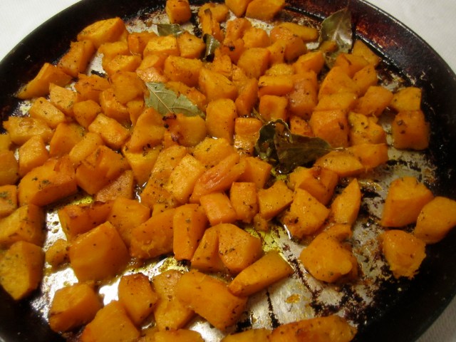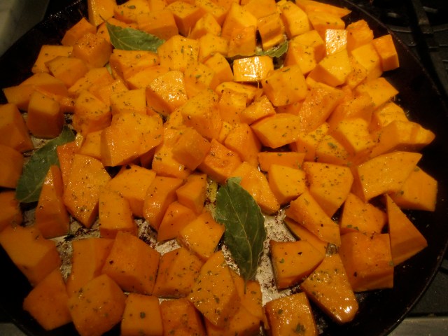The traditional way to make this dish is to peel and slice the pumpkin, and saute it in a skillet. I chose, instead, to roast it in the oven, which resulted in soft, sweet cubes of squash, scented with the herbs, that required almost no attention. I would recommend it highly.