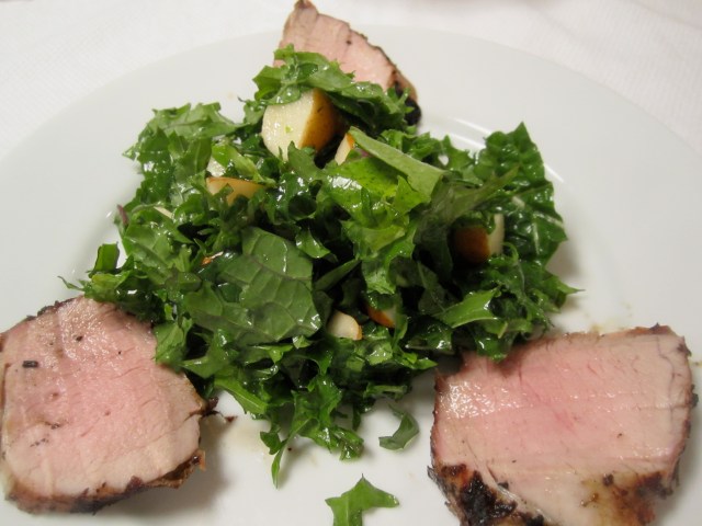 Along with the squash, we had dry-rubbed pork tenderloin and a salad of just-picked russian kale with sweet, local ripe bosc pears, dressed with red wine vinegar, agave and a touch of olive oil–the perfect fall meal.