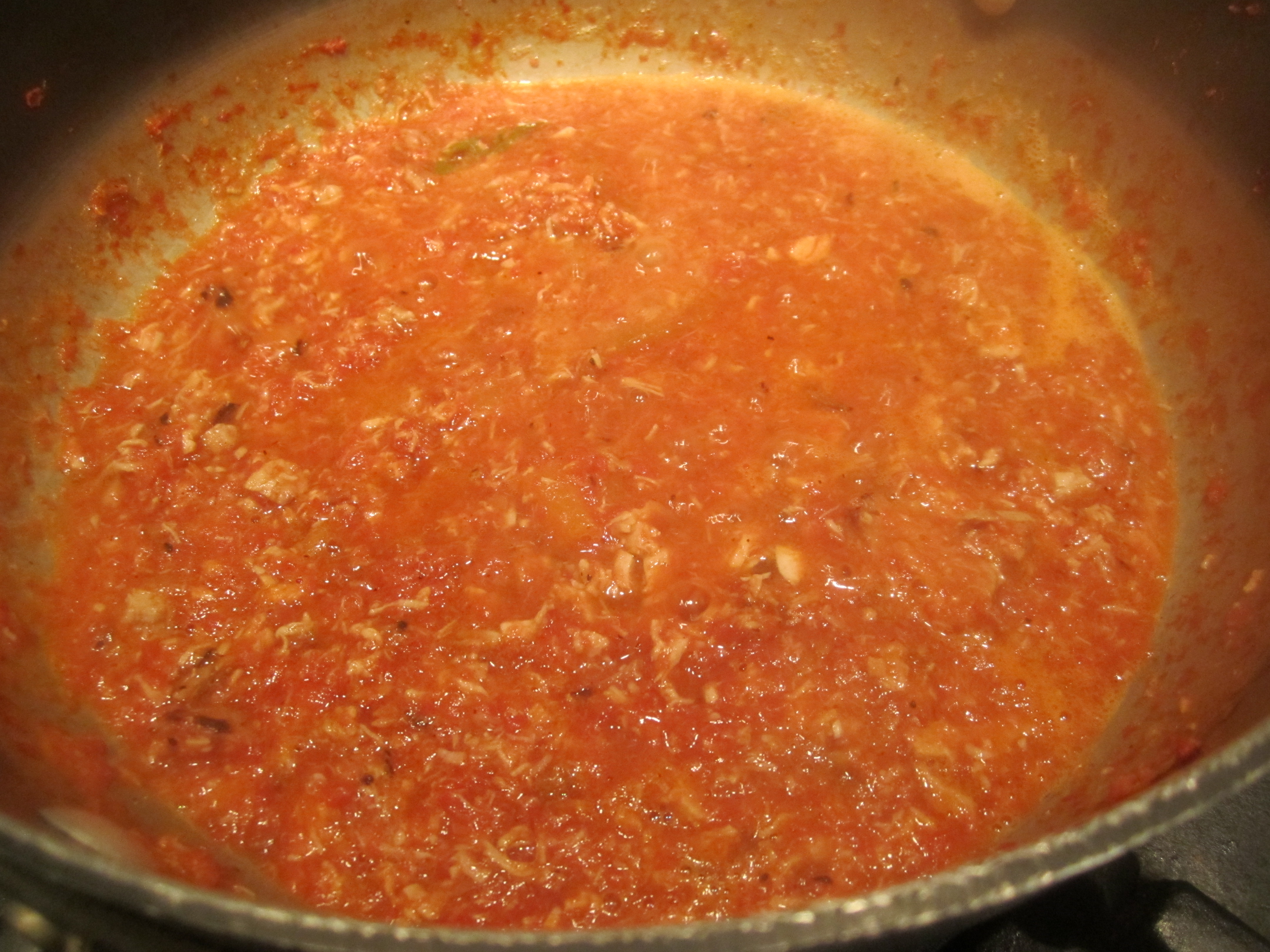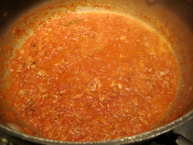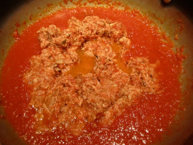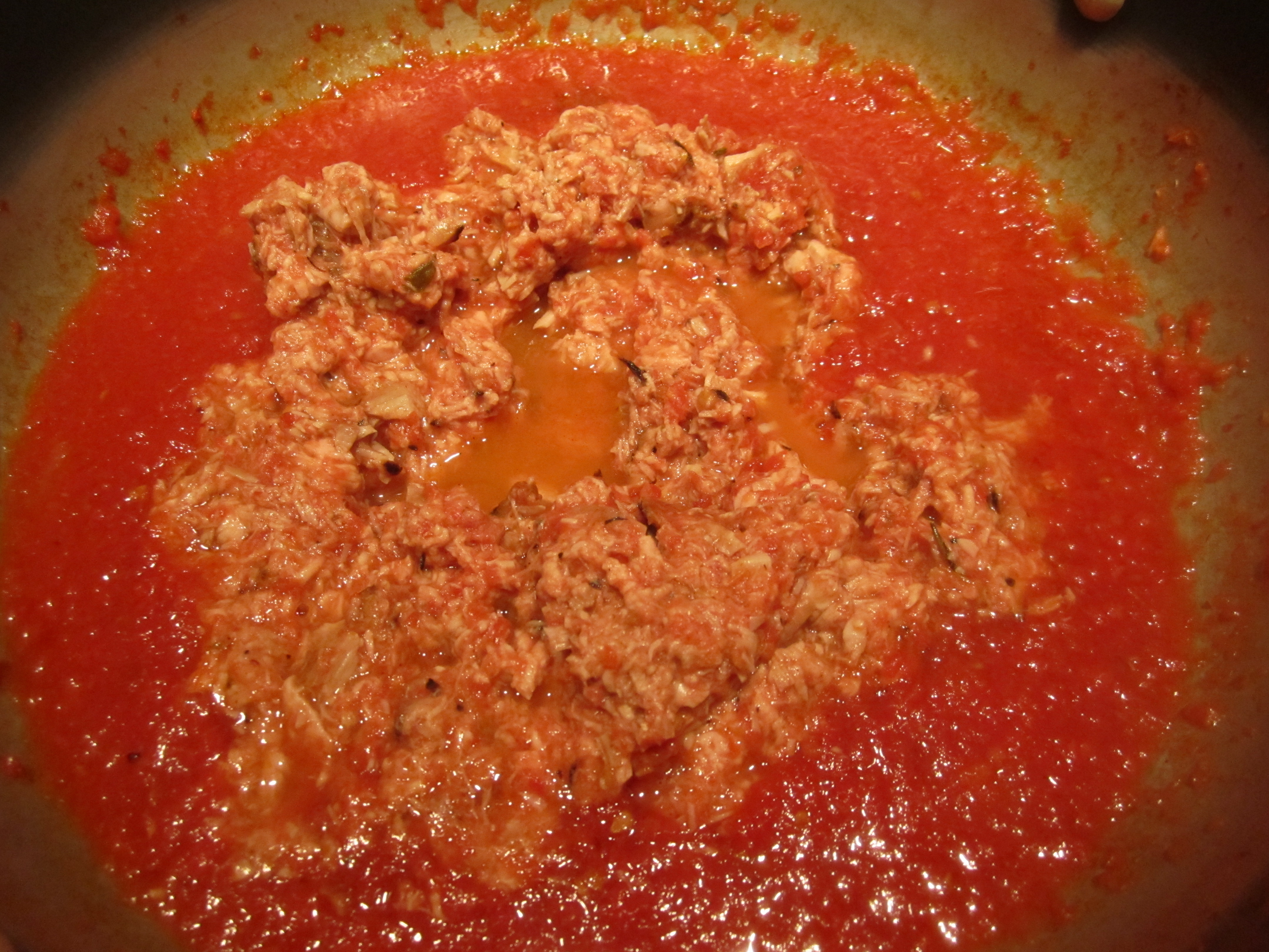 Pulse the pork in the food processor about 5 or 6 times (a few seconds per pulse) until it is coarsely chopped. Add to tomato sauce, along with butter and simmer on lowest heat for about 10 minutes, while the pasta cooks.