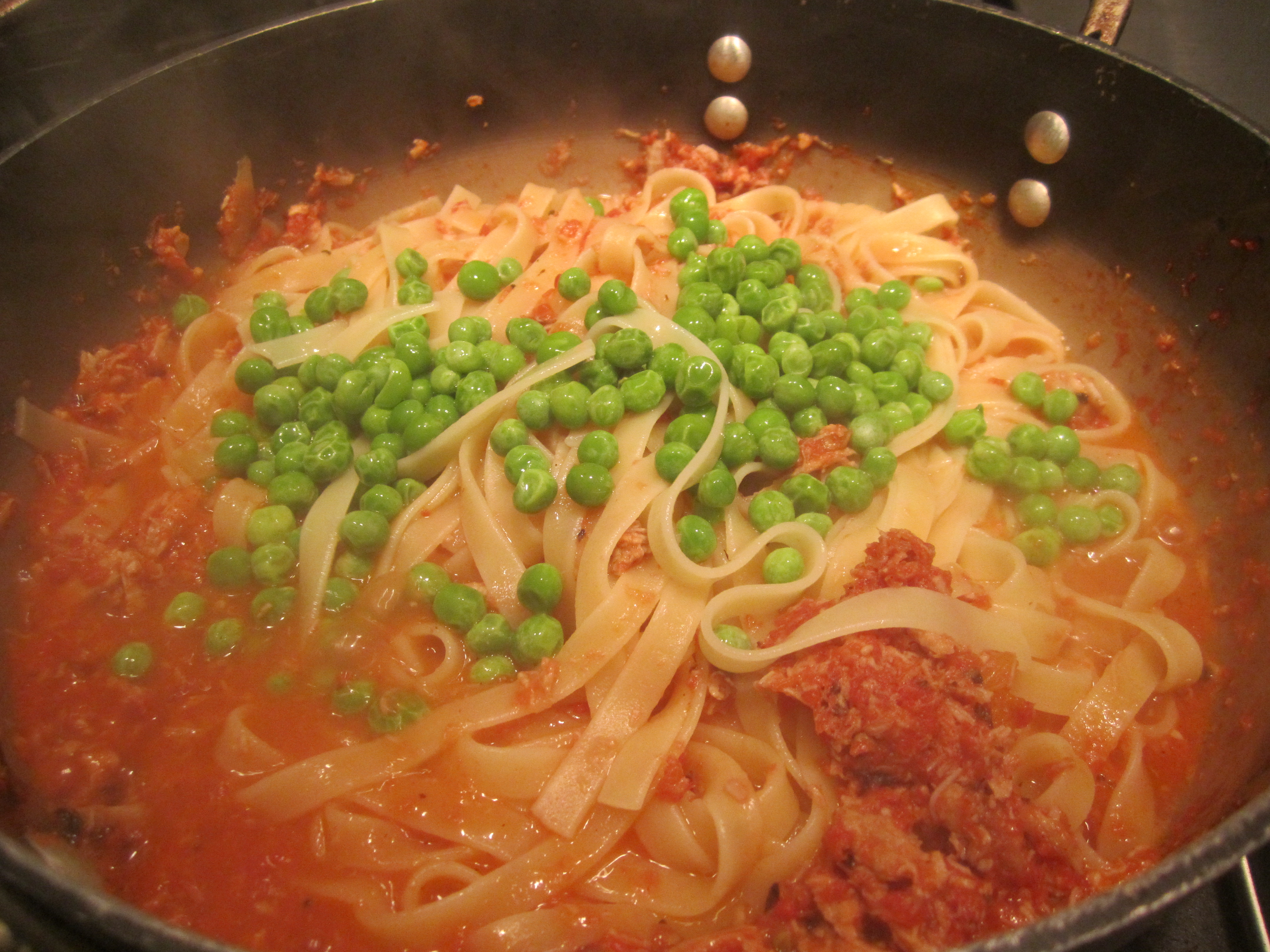 When pasta is just about cooked, add peas to pasta pot and cook for about 30 seconds longer. Drain and add pasta and peas to sauce, along with about a half-cup of pasta cooking liquid. Drizzle on the olive oil, stir and toss for about a minute.