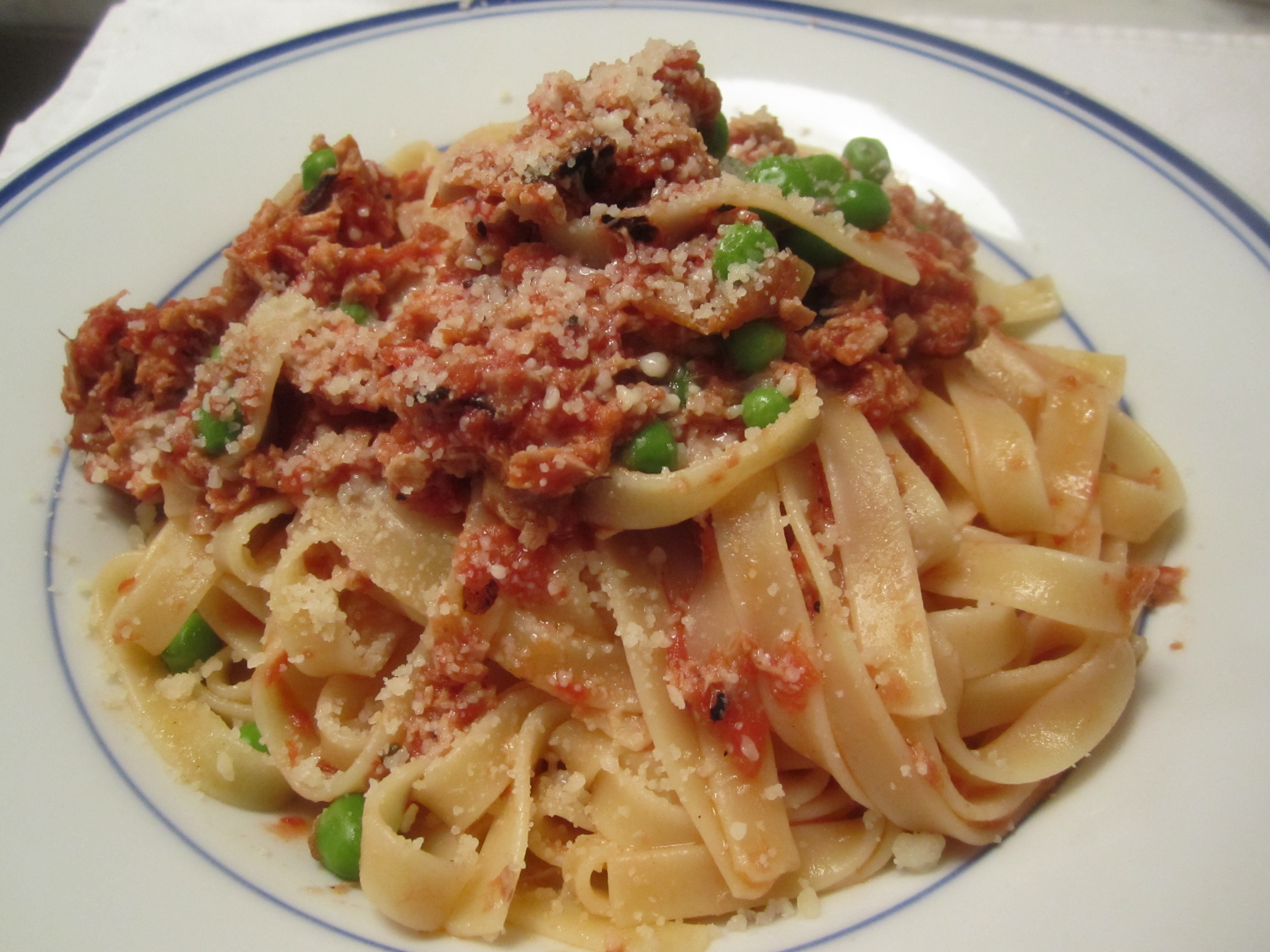 This is not a true long-simmered pork ragu, which would require raw ground pork and 2 to 3 hours of simmering. Rather, this is fully cooked pork tenderloin that has been coarsely ground in the food processor and briefly simmered in great tomato sauce. Pasta is cooked and added to the ragu, along with a handful of frozen peas at the last minute.