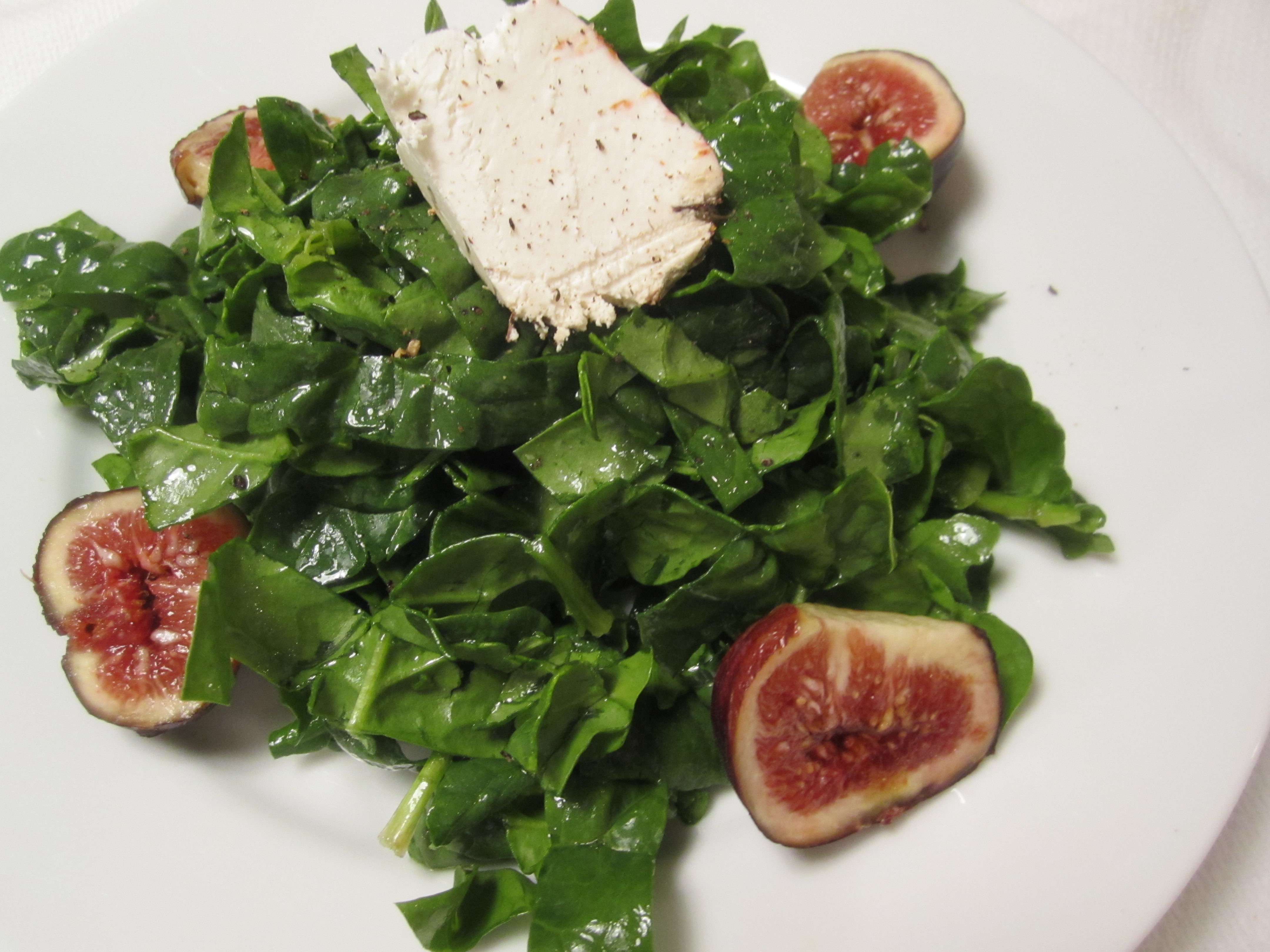 Tonight, in addition to the pasta, we had a wonderful salad–local spinach, with figs and herbed goat cheese. It’s a rare treat to find a basket of figs which are all perfectly soft, ripe and sweet. I spotted the figs at my market, squeezed every single one of them, and realized they’d be great. I dressed the greens with my red wine vinegar/agave/olive oil combination., then arranged the figs around the greens (after eating a few). They were an amazing and unexpected treat–almost as good as in Italy.