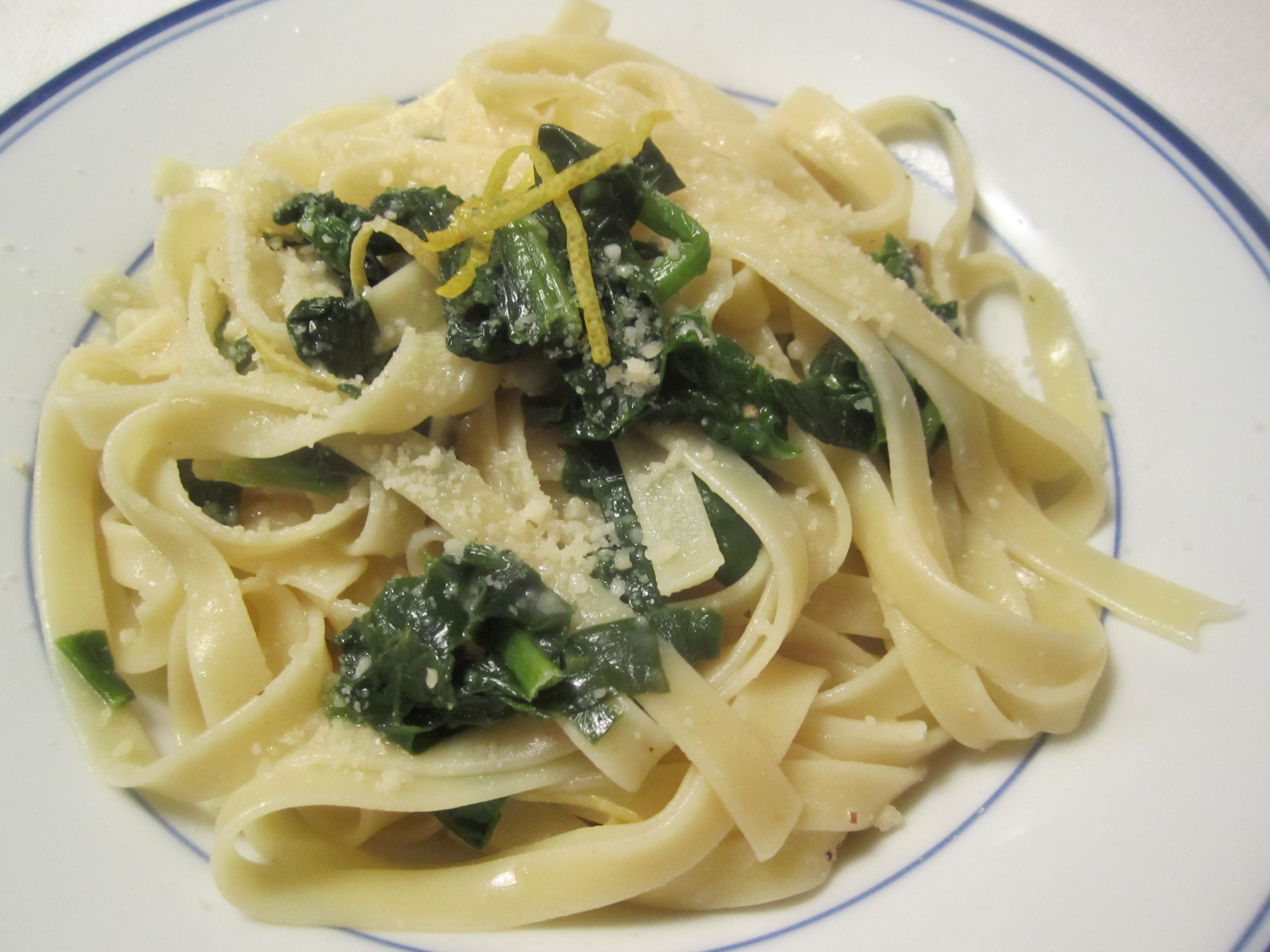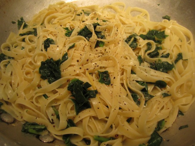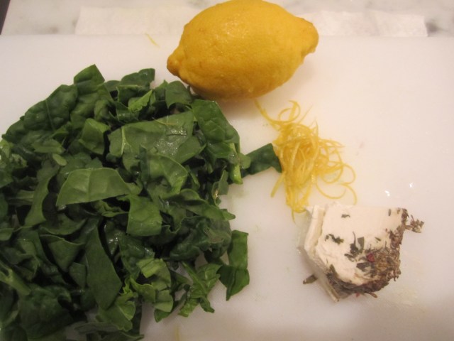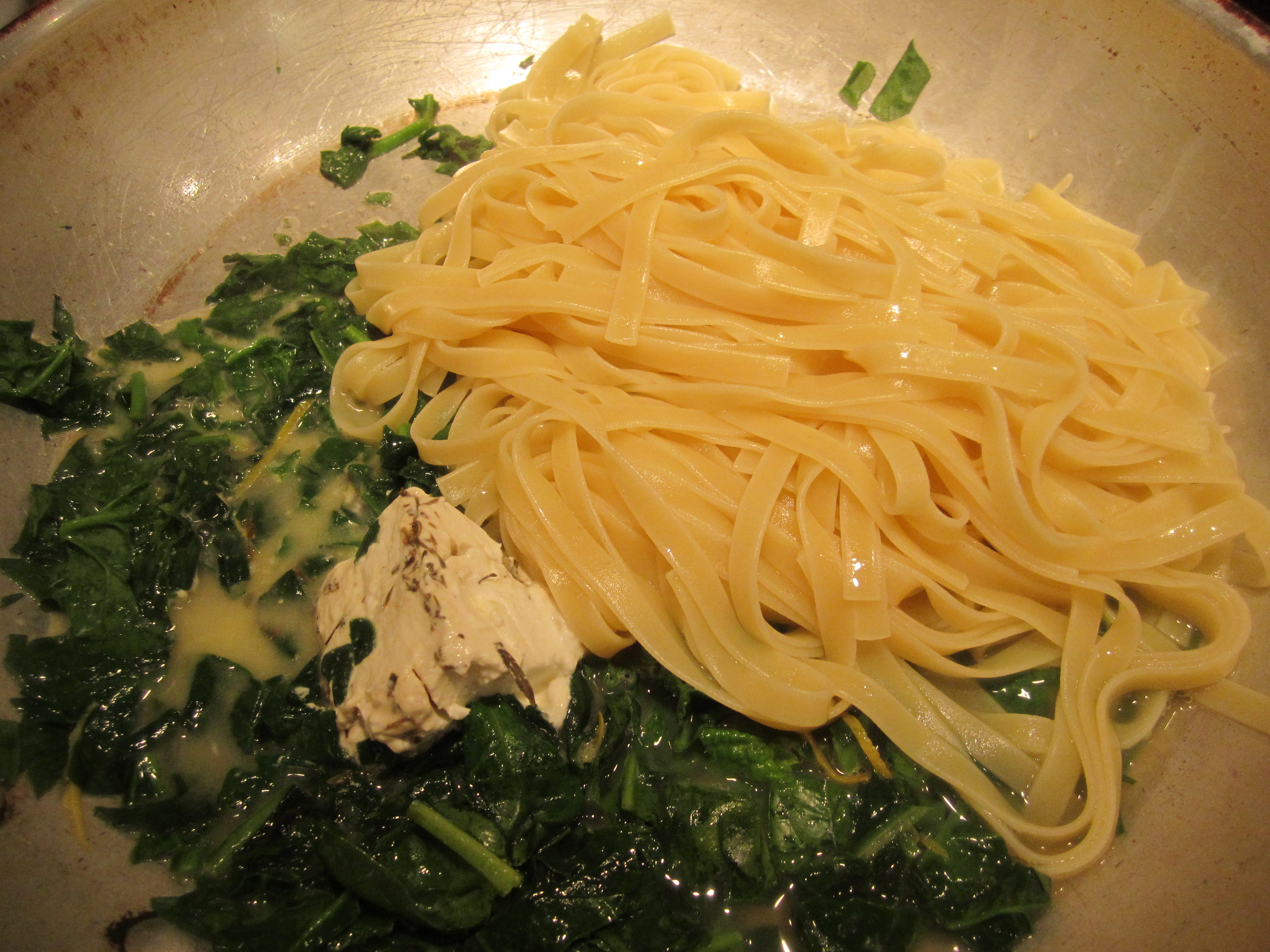 The same combination of flavors can also be assembled into a quick pasta dish for a weeknight meal. Simple fettucine can be dressed with ribbons of spinach, butter, goat cheese (melted right into the sauce), and a few strips of lemon zest for bright, tartness. A bit of chicken broth pulls all the flavors together, then disperses them evenly into a sauce.