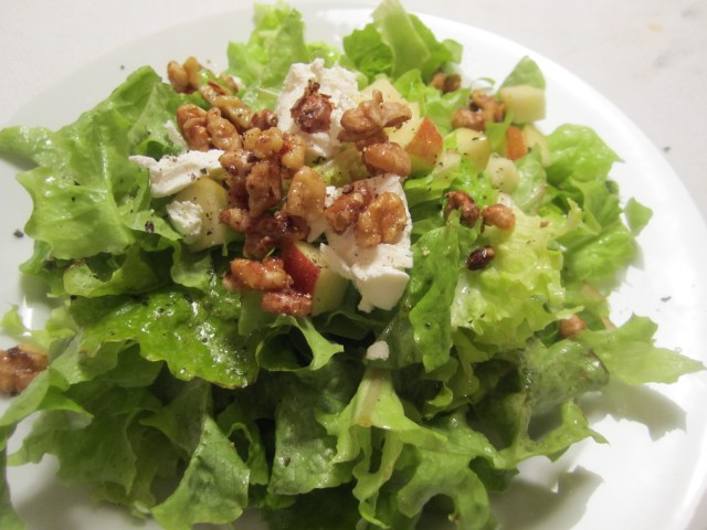 Tonight, we had a very simple salad of delicate “salad bowl” lettuce, diced apples, goat cheese and candied walnuts–the perfect light, pre-thanksgiving meal.