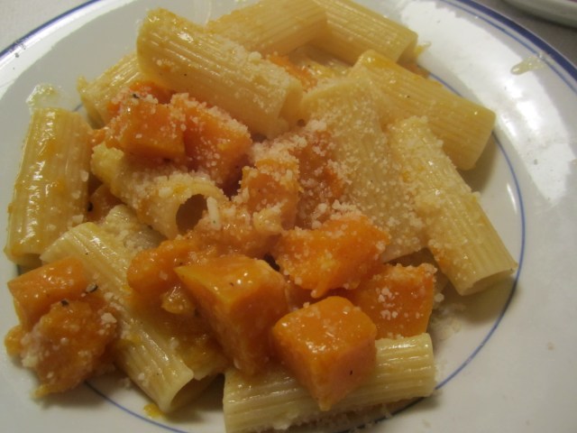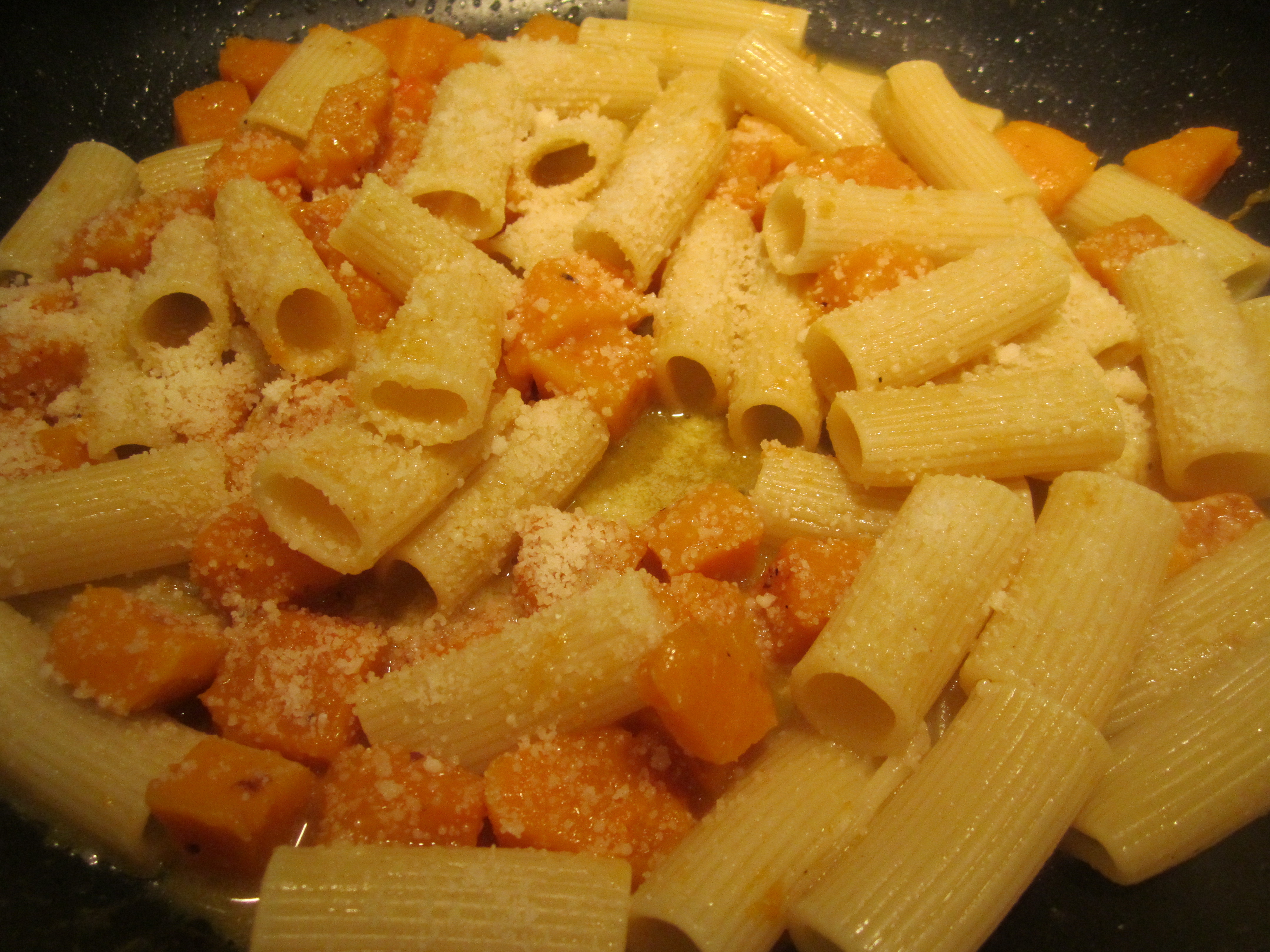 The squash gets peeled, cubed and sauteed with olive oil and water until tender. A pinch of cinammon and nutmeg are added, as well as some broth. The pasta gets added, along with pasta water. The starch from the pasta, combined with the butter and spices, make for a complex, smooth and luxurious sauce.