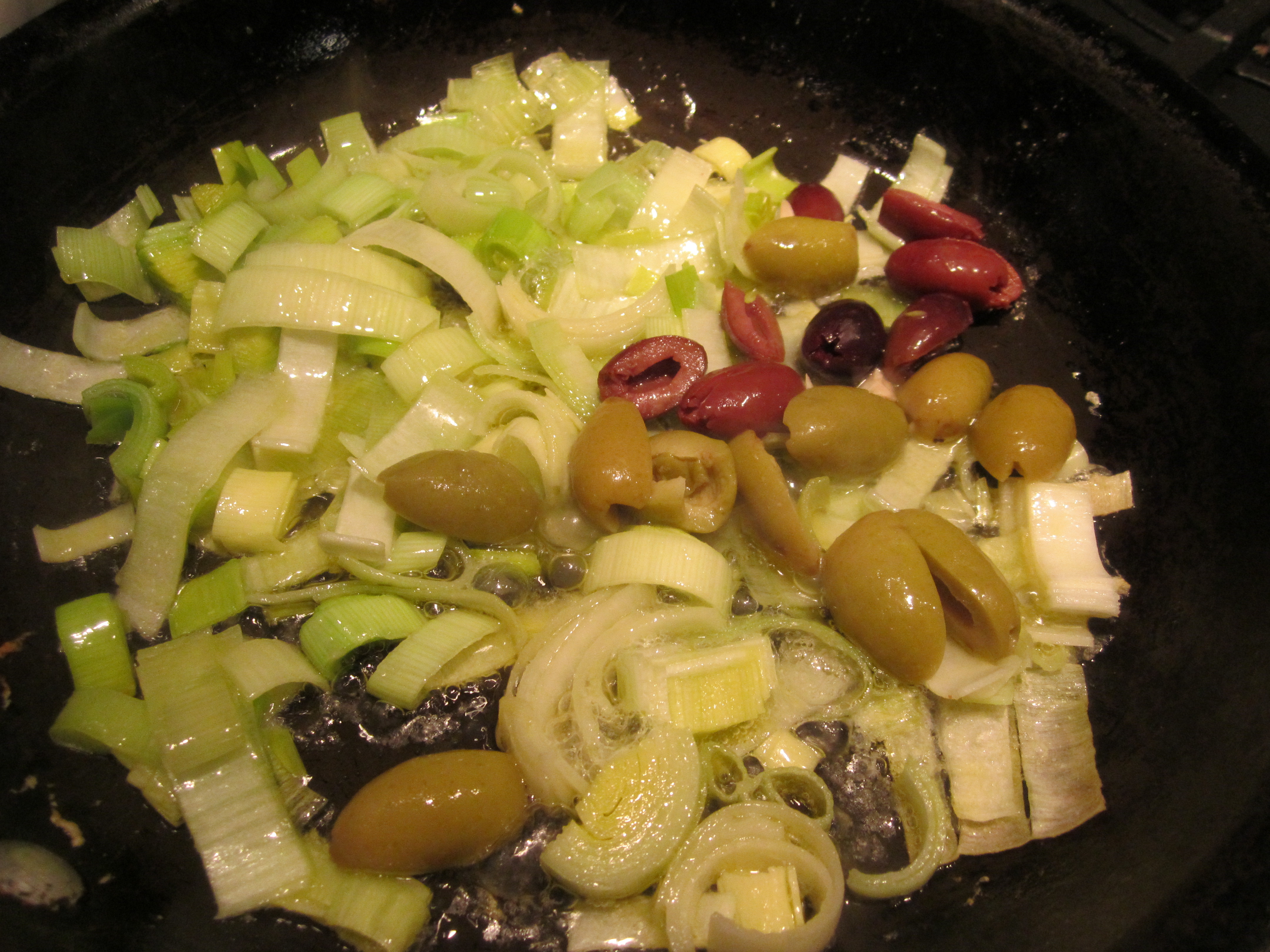 In an ovenproof skillet, combine the leeks, olives and half the olive oil. Sprinkle with salt and pepper.