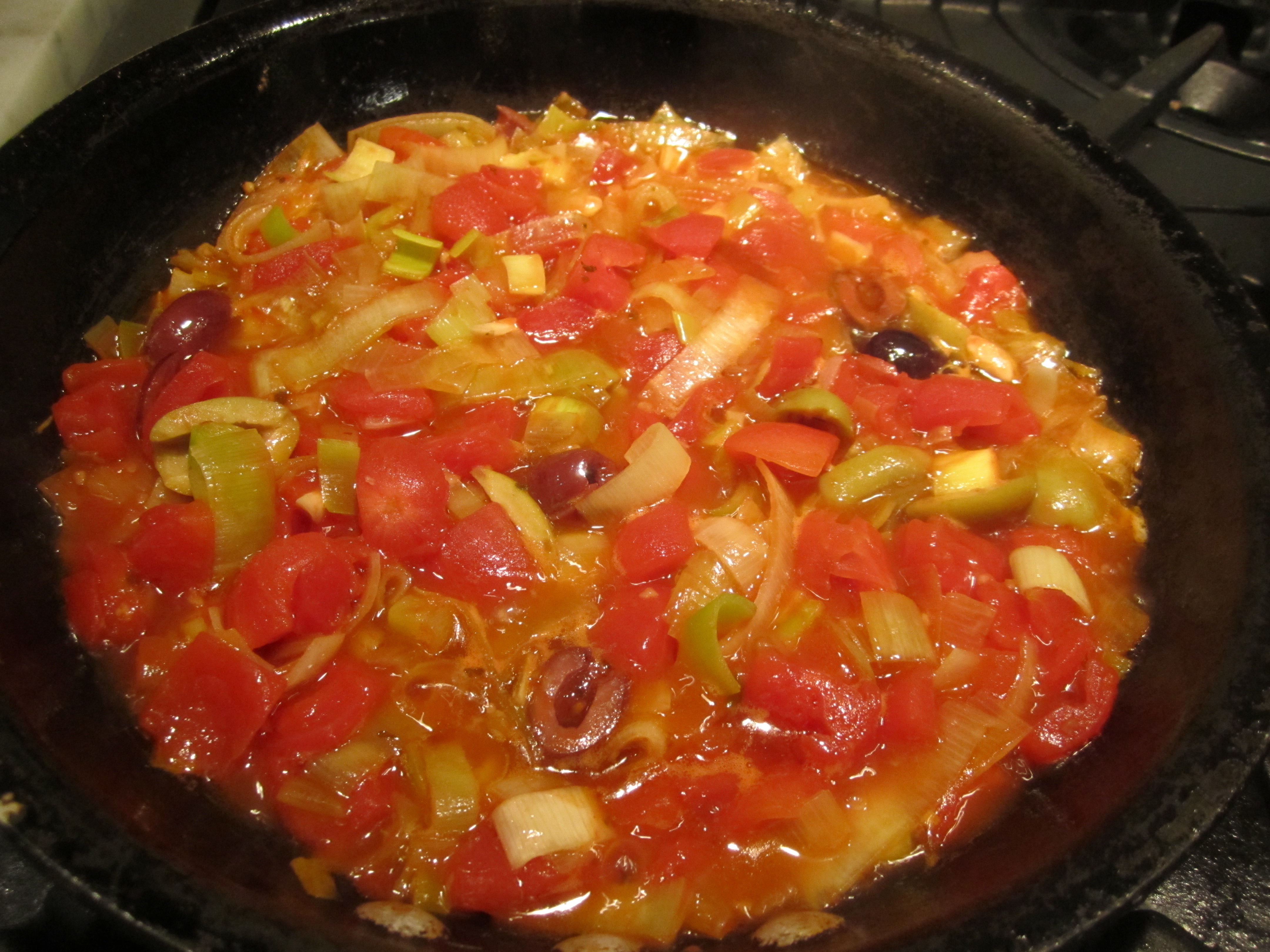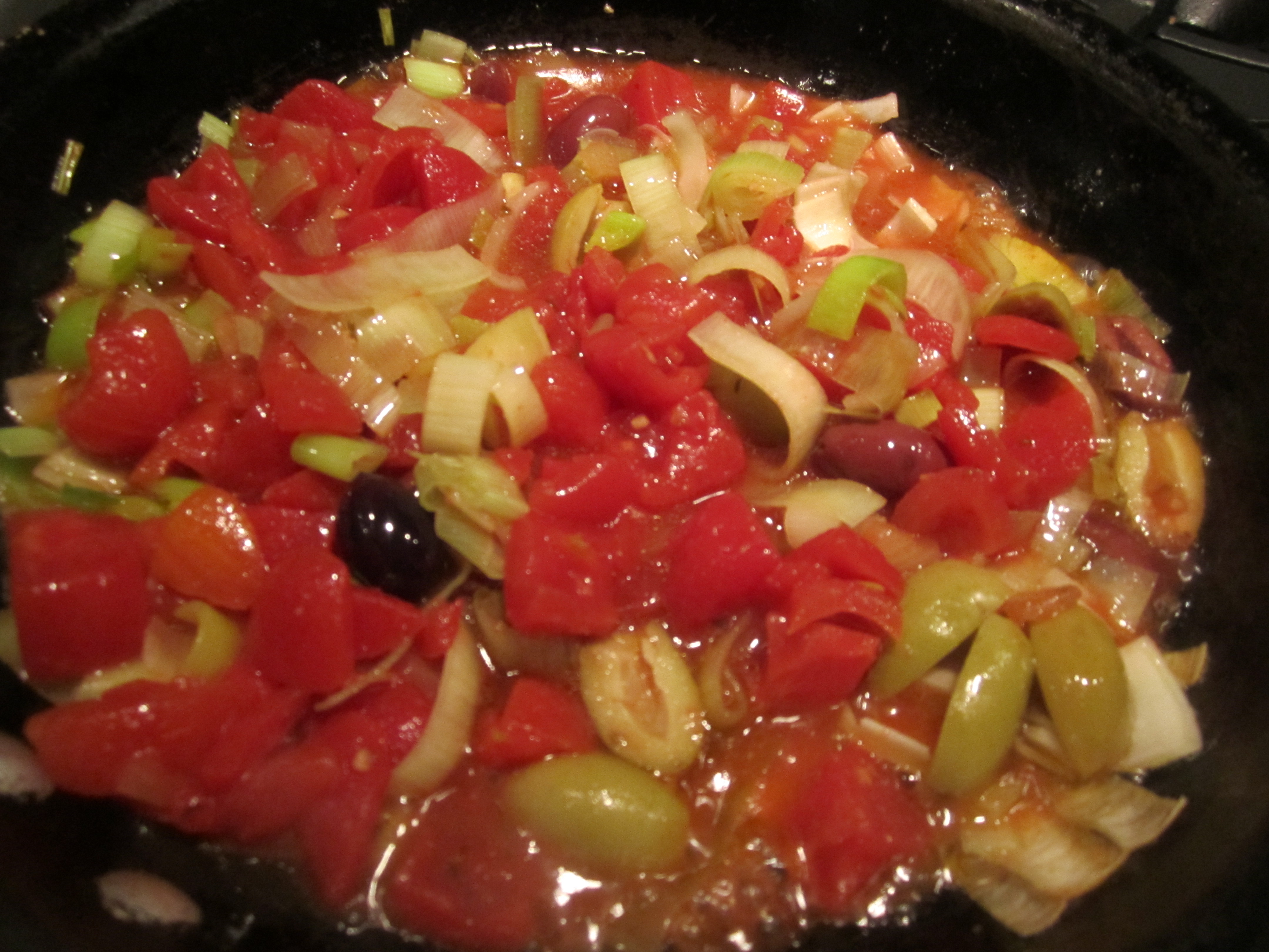 This dish is a combination of a pan-sear and a stew. With leeks still in season, I’ve decided to make a light tomato sauce with leeks, olives and white wine. This is a tart but delicate sauce that’s great with just about any fish.