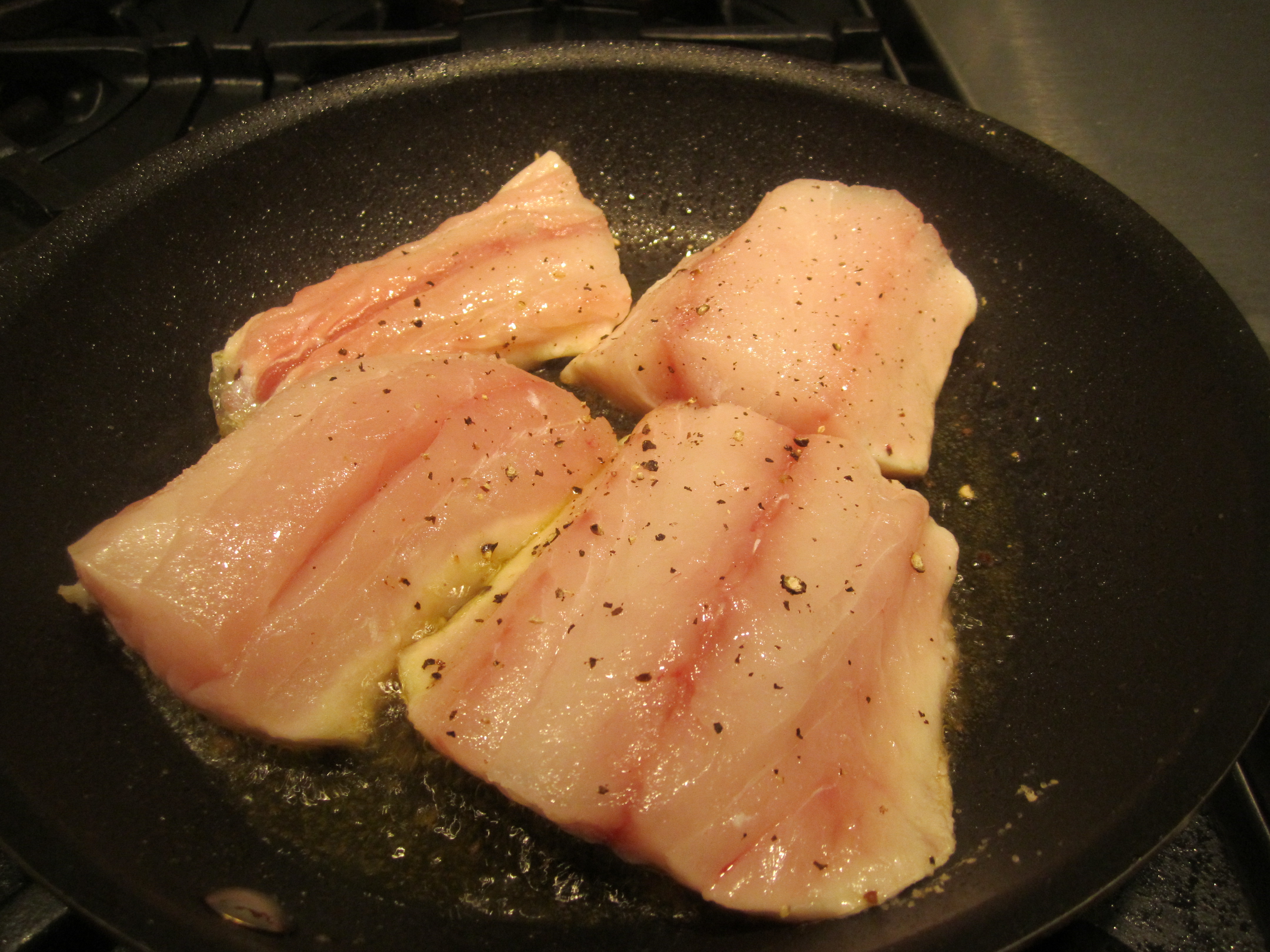 Heat a nonstick skillet on high heat for about 1 minute, then add 1 tablespoon olive oil. Spinkle fish with salt and pepper on both sides and genlty slip the fish filets into the hot oil, skin side down.