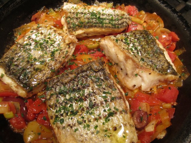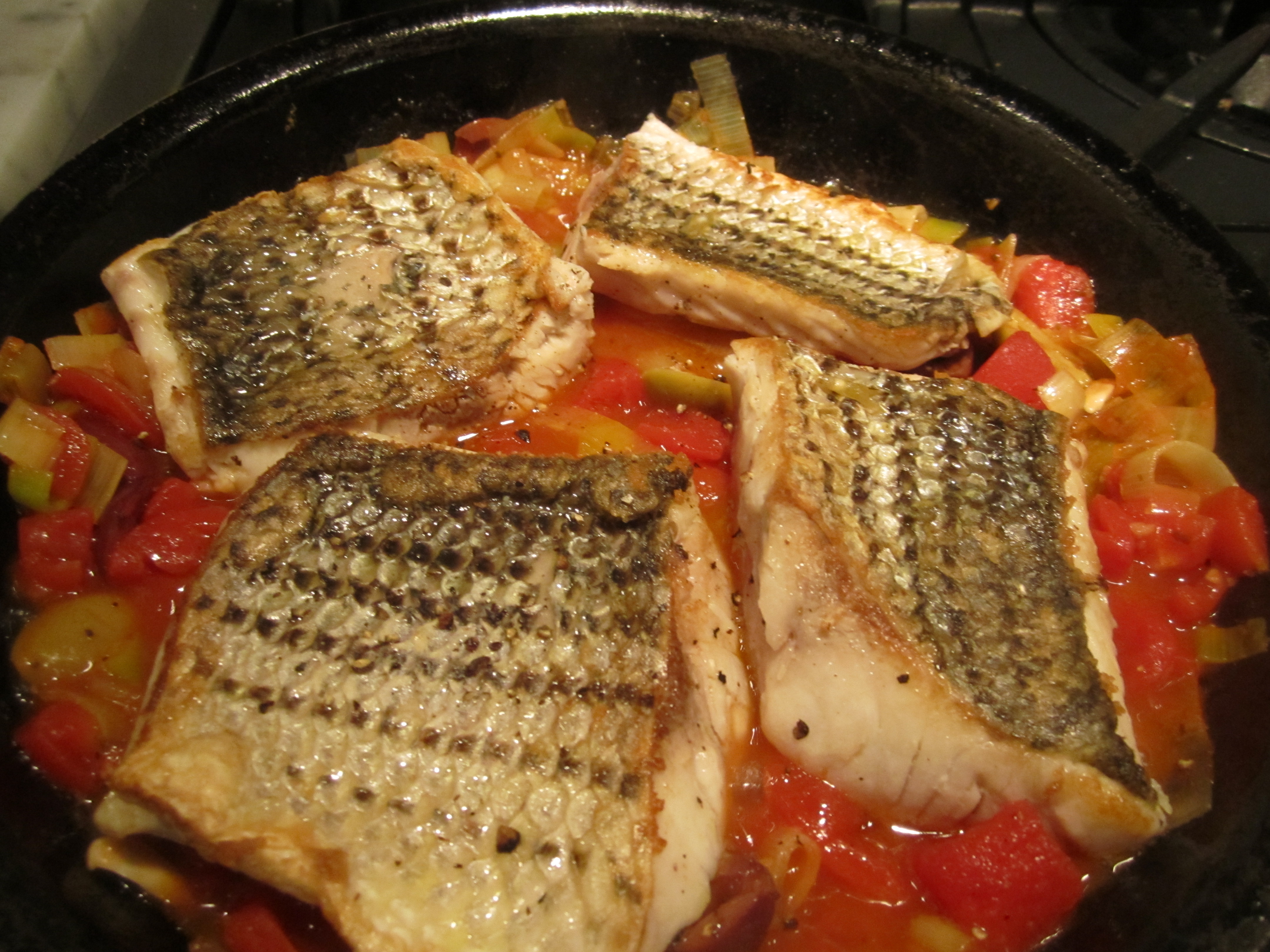 The sauce is made in an ovenproof skillet large enough to hold the fish. The fish gets seared separately on the skin side, which makes the skin golden and crispy. The fish is then nestled in the sauce skin side up. The skillet is placed in a 400 degree oven and allowed to braise for about 10 minutes (depending on the thickness of your filets).