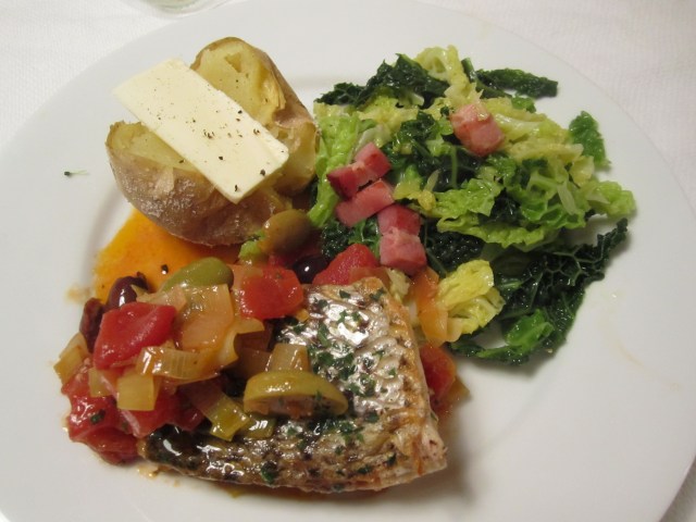 Along with the fish, I served buttery (even before I added the butter) baked yukon gold potatoes coated with salt, and savoy cabbage with bacon. The smokey bacon flavor on the plate also marries quite well with striped bass.