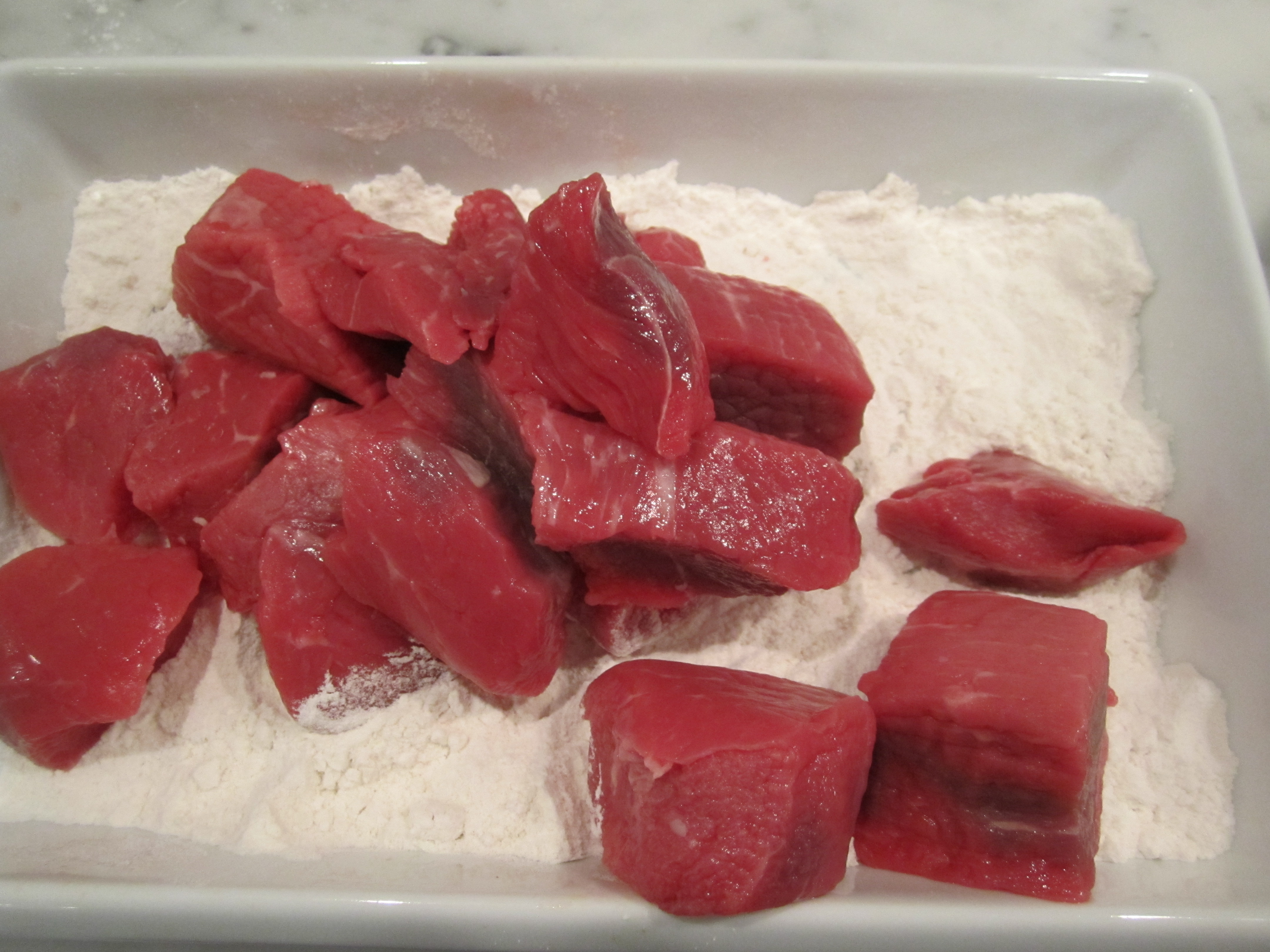 Heat olive oil in a dutch oven on high heat. Sprinkle meat with salt and dredge cubes in flour.