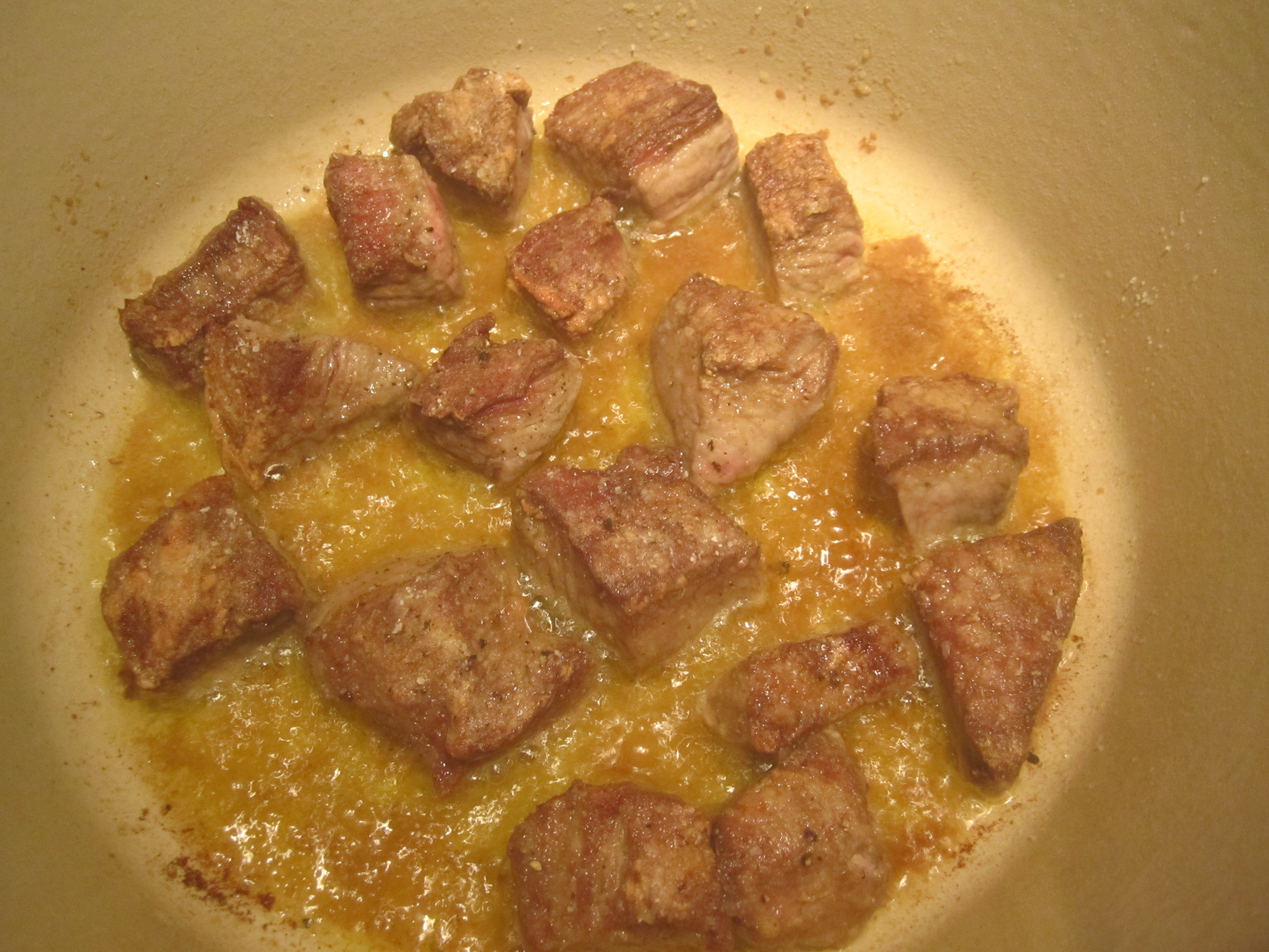 Shake off excess flour and place meat in hot oil. Brown on all sides over medium heat (about 8 minutes total). Work in batches, if necessary and set meat aside.