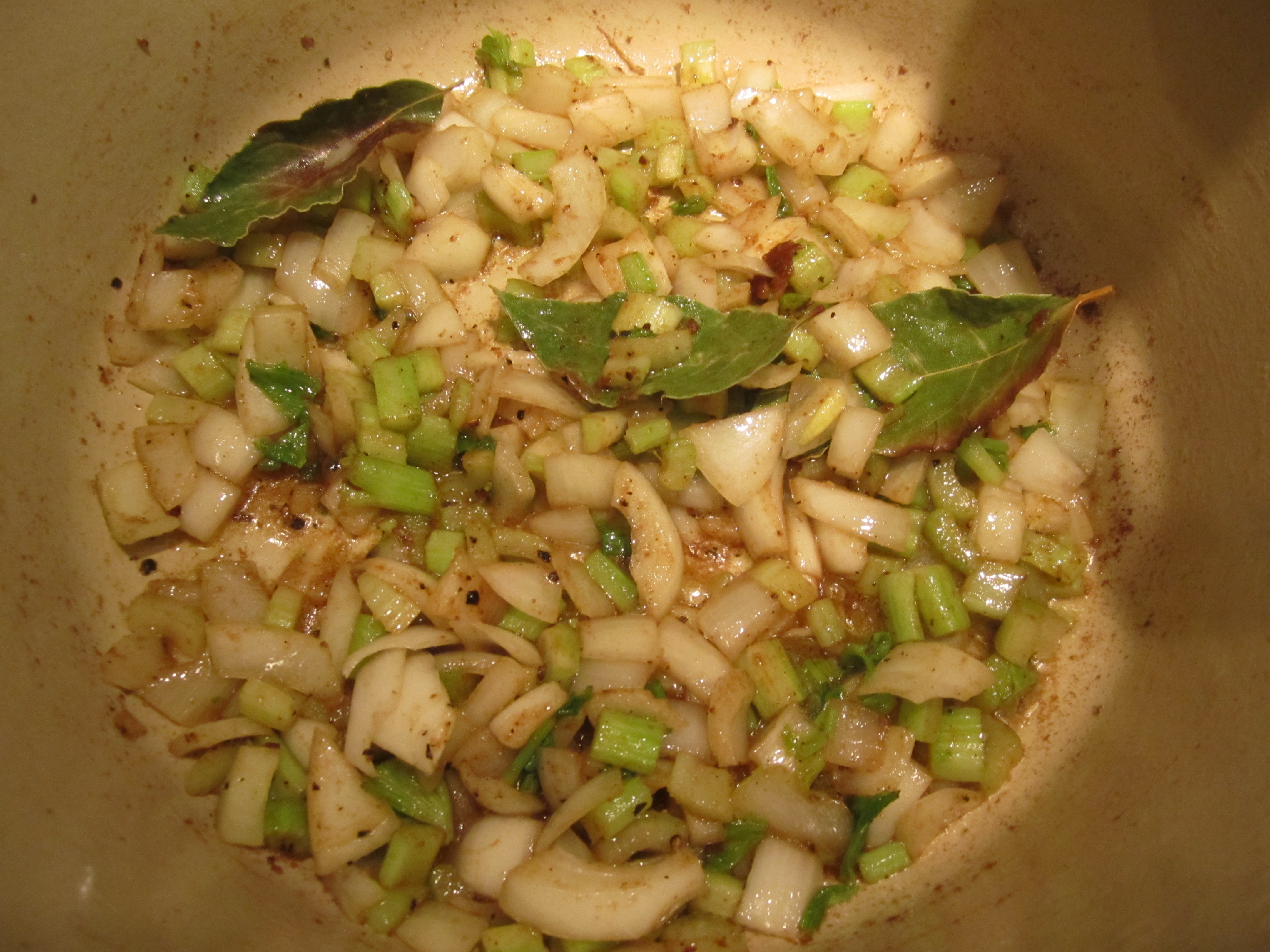 Add onions, celery and bay leaves and reduce heat to medium low. Stir to release brown bits from bottom and sides of pot. Saute for about 8 minutes or until translucent.