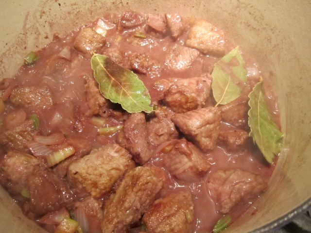 Cubes of beef chuck are dredged in flour and browned in olive oil. Celery, onions and bay leaves are then sauteed, then red wine and broth are added. The stew simmers partially covered for about two hours.