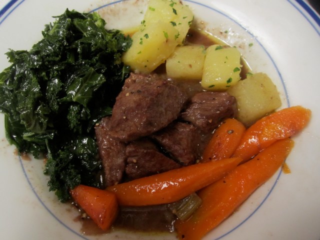 I served the stew with boiled carrots, potatoes and sauteed kale. All that was necessary was plenty of warm bread to soak up the magnificent brown sauce that forms the base of this stew.