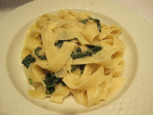 For our first course, I decided to make a simple pasta–fettucine with baby spinach, butter and parmigiano. This dish is so easy, I almost consider it cheating when I serve it to company–but it’s always comforting and well-received. It’s simply a box of pre-washed baby spinach tossed in a skillet of melted butter to wilt (plus a touch of chicken broth), then combined with pasta ribbons and lots of grated cheese.