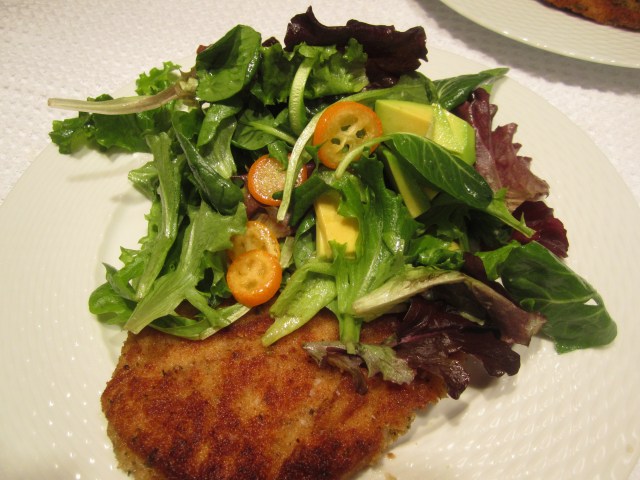 After we finished pasta, I tossed the salad and served a large pile beside the slices of breaded pork. The salad was a revelation–the kumquats infused the dish with their sweet-tart flavor; the avocado with its buttery richness, and the dressing of lemon juice and extra-virgin olive oil added its own brightness and richness to the baby greens.