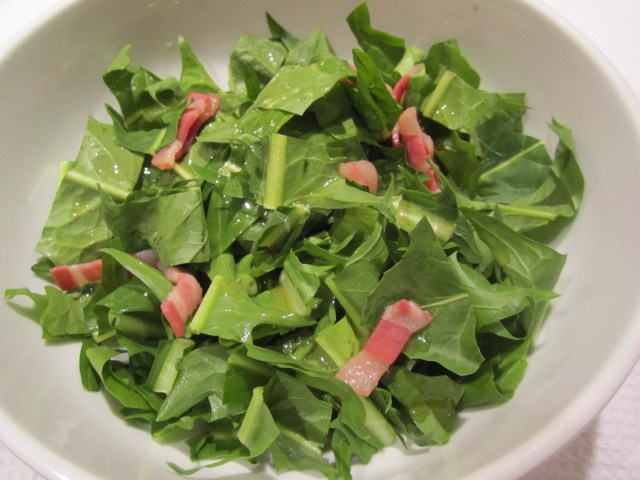 As a salad, I served some wonderful raw Florida dandelion greens with dressing of warm pancetta, olive oil, agave and red wine vinegar. Simply render the pancetta in a tablespoon of olive oil, then add a tablespoon of red wine vinegar and a teaspoon of agave. Pour over greens, toss and top with crispy pancetta.